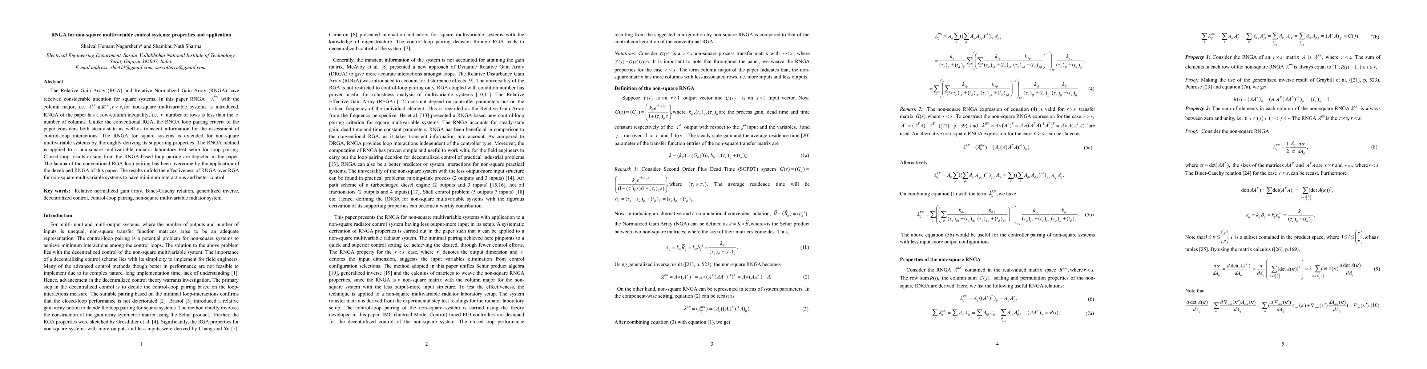 This paper introduces a modified RNGA (Relative Normalized Gain Array) for non-square multivariable control systems, extending the conventional RGA (Relative Gain Array) method. The new RNGA considers both steady-state and transient information for loop pairing, overcoming the limitations of traditional RGA. Applied to a radiator test setup, the RNGA demonstrates improved control with minimal interactions in non-square systems.