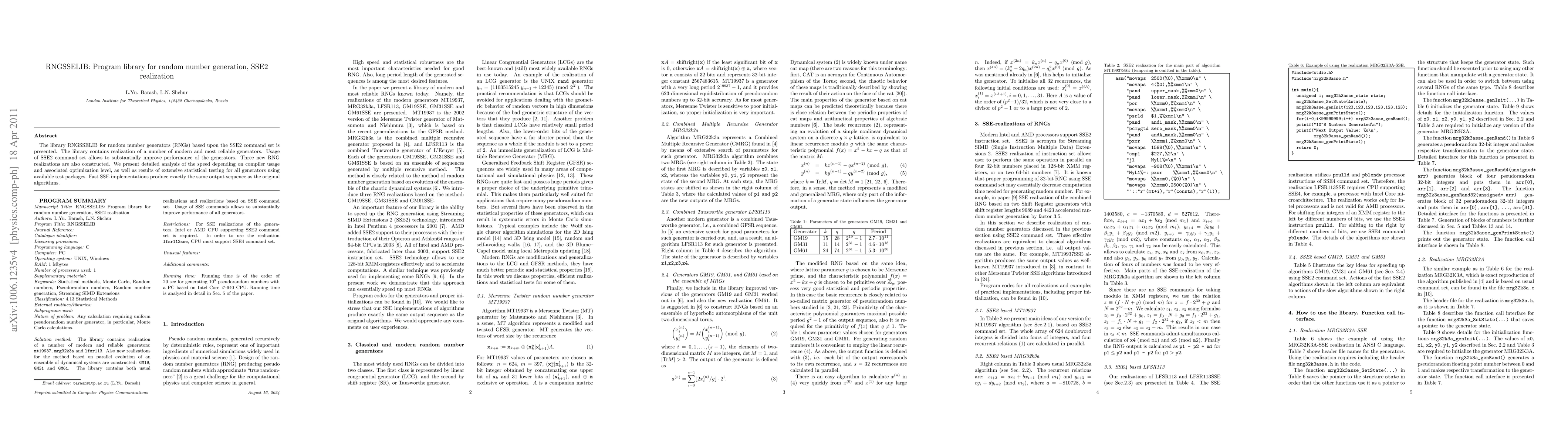 The library RNGSSELIB for random number generators (RNGs) based upon the SSE2 command set is presented. The library contains realization of a number of modern and most reliable generators. Usage of SSE2 command set allows to substantially improve performance of the generators. Three new RNG realizations are also constructed. We present detailed analysis of the speed depending on compiler usage and associated optimization level, as well as results of extensive statistical testing for all generators using available test packages. Fast SSE implementations produce exactly the same output sequence as the original algorithms.