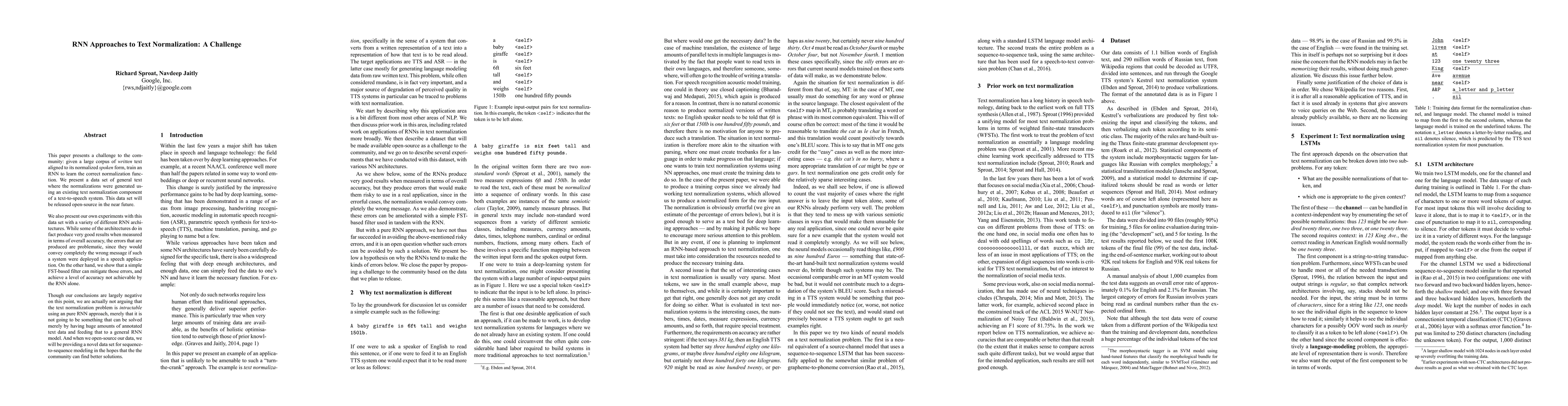 This paper challenges the community to train RNNs on a new open-source dataset for text normalization, finding that while some RNN architectures achieve high accuracy, they produce errors that could mislead speech applications. The authors suggest that a combination of FST-based filters with RNNs may offer better results.