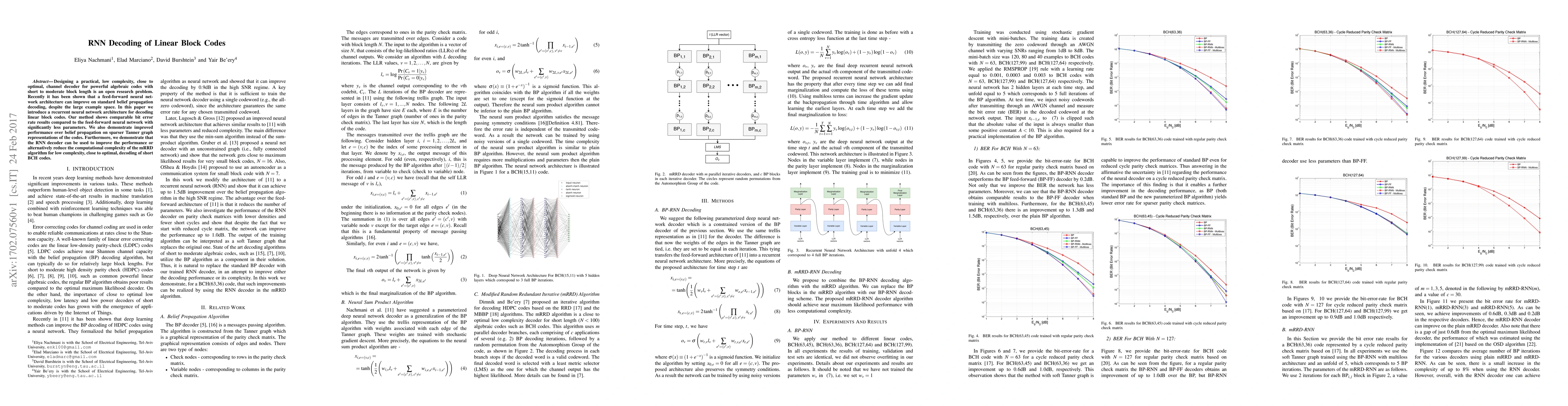 This paper proposes a recurrent neural network (RNN) architecture for decoding linear block codes, achieving comparable bit error rates to feed-forward neural networks but with fewer parameters. It also outperforms belief propagation on sparser Tanner graphs and enhances the mRRD algorithm for decoding short BCH codes.