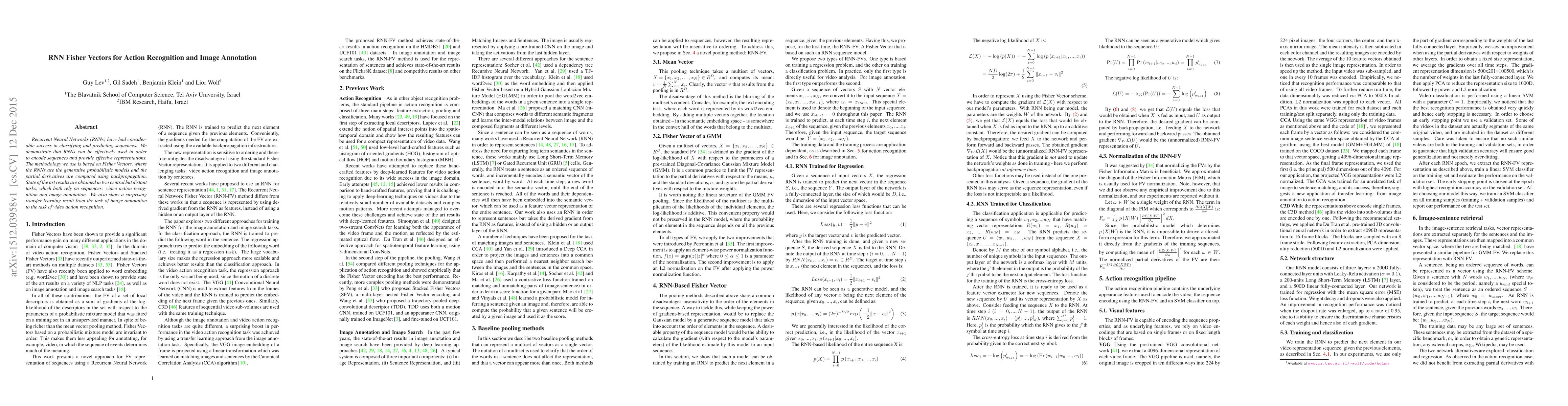 Recurrent Neural Networks (RNNs) have had considerable success in classifying and predicting sequences. We demonstrate that RNNs can be effectively used in order to encode sequences and provide effective representations. The methodology we use is based on Fisher Vectors, where the RNNs are the generative probabilistic models and the partial derivatives are computed using backpropagation. State of the art results are obtained in two central but distant tasks, which both rely on sequences: video action recognition and image annotation. We also show a surprising transfer learning result from the task of image annotation to the task of video action recognition.