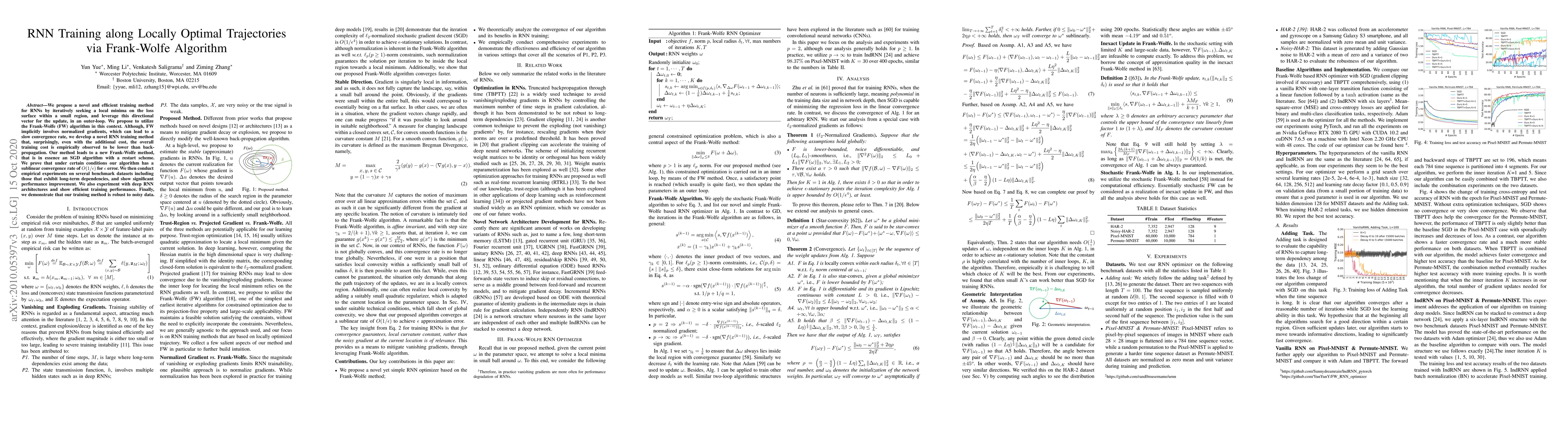 We propose a novel and efficient training method for RNNs by iteratively seeking a local minima on the loss surface within a small region, and leverage this directional vector for the update, in an outer-loop. We propose to utilize the Frank-Wolfe (FW) algorithm in this context. Although, FW implicitly involves normalized gradients, which can lead to a slow convergence rate, we develop a novel RNN training method that, surprisingly, even with the additional cost, the overall training cost is empirically observed to be lower than back-propagation. Our method leads to a new Frank-Wolfe method, that is in essence an SGD algorithm with a restart scheme. We prove that under certain conditions our algorithm has a sublinear convergence rate of $O(1/\epsilon)$ for $\epsilon$ error. We then conduct empirical experiments on several benchmark datasets including those that exhibit long-term dependencies, and show significant performance improvement. We also experiment with deep RNN architectures and show efficient training performance. Finally, we demonstrate that our training method is robust to noisy data.