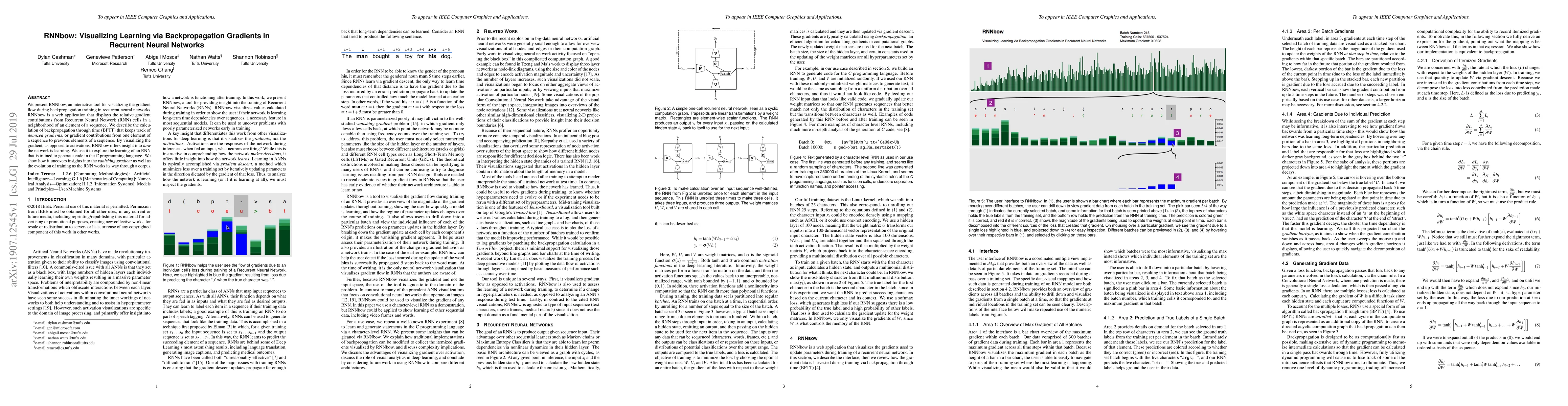 RNNbow is an interactive web tool for visualizing gradient flow during backpropagation in RNNs, offering insights into learning by displaying gradient contributions from sequence elements. It helps uncover issues like vanishing gradients and track training progress in RNNs trained to generate C code.