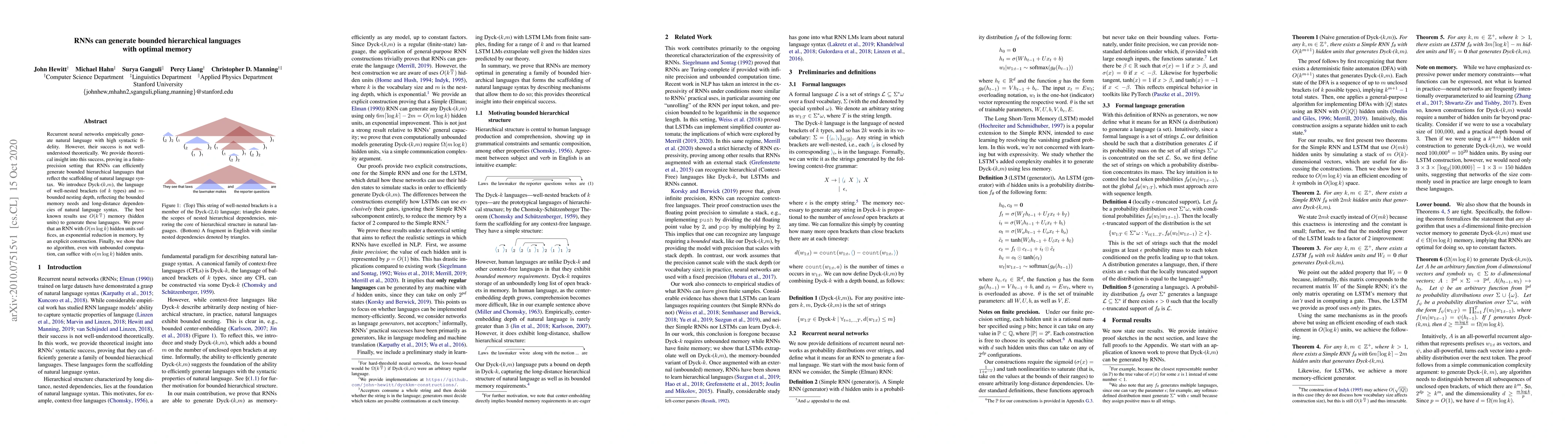 Recurrent neural networks empirically generate natural language with high syntactic fidelity. However, their success is not well-understood theoretically. We provide theoretical insight into this success, proving in a finite-precision setting that RNNs can efficiently generate bounded hierarchical languages that reflect the scaffolding of natural language syntax. We introduce Dyck-($k$,$m$), the language of well-nested brackets (of $k$ types) and $m$-bounded nesting depth, reflecting the bounded memory needs and long-distance dependencies of natural language syntax. The best known results use $O(k^{\frac{m}{2}})$ memory (hidden units) to generate these languages. We prove that an RNN with $O(m \log k)$ hidden units suffices, an exponential reduction in memory, by an explicit construction. Finally, we show that no algorithm, even with unbounded computation, can suffice with $o(m \log k)$ hidden units.