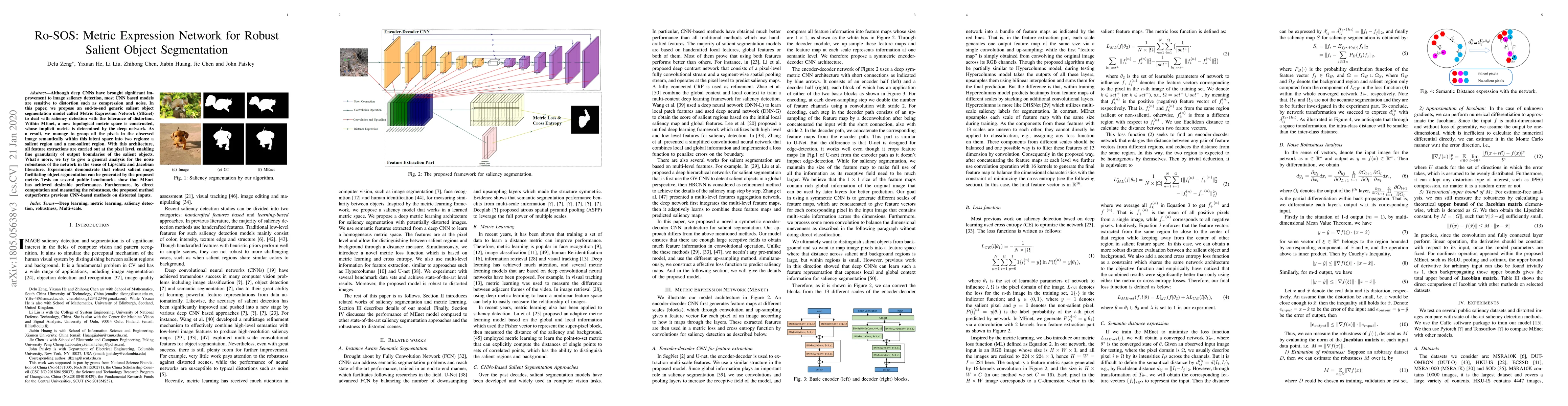 Although deep CNNs have brought significant improvement to image saliency detection, most CNN based models are sensitive to distortion such as compression and noise. In this paper, we propose an end-to-end generic salient object segmentation model called Metric Expression Network (MEnet) to deal with saliency detection with the tolerance of distortion. Within MEnet, a new topological metric space is constructed, whose implicit metric is determined by the deep network. As a result, we manage to group all the pixels in the observed image semantically within this latent space into two regions: a salient region and a non-salient region. With this architecture, all feature extractions are carried out at the pixel level, enabling fine granularity of output boundaries of the salient objects. What's more, we try to give a general analysis for the noise robustness of the network in the sense of Lipschitz and Jacobian literature. Experiments demonstrate that robust salient maps facilitating object segmentation can be generated by the proposed metric. Tests on several public benchmarks show that MEnet has achieved desirable performance. Furthermore, by direct computation and measuring the robustness, the proposed method outperforms previous CNN-based methods on distorted inputs.