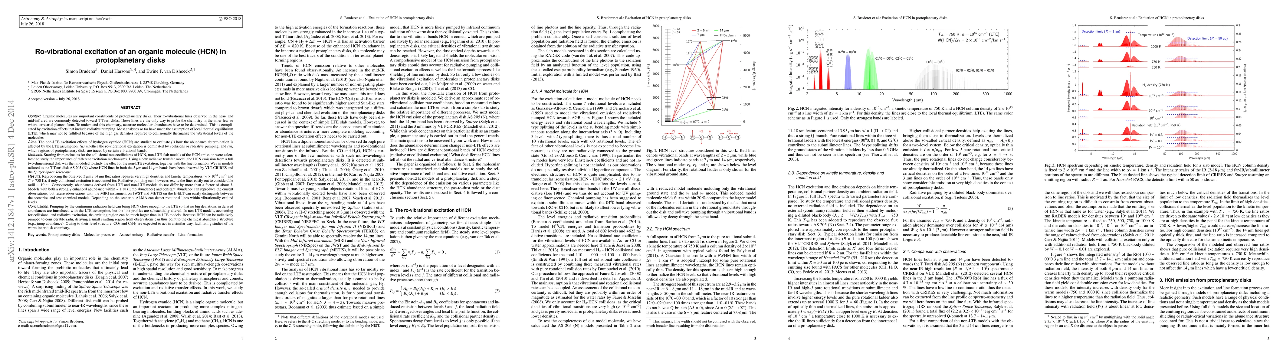 (Abridged) Organic molecules are important constituents of protoplanetary disks. Their ro-vibrational lines observed in the near- and mid-infrared are commonly detected toward T Tauri disks. These lines are the only way to probe the chemistry in the inner few au where terrestrial planets form. To understand this chemistry, accurate molecular abundances have to be determined. This is complicated by excitation effects. Most analyses so far have made the assumption of local thermal equilibrium (LTE). Starting from estimates for the collisional rate coefficients of HCN, non-LTE slab models of the HCN emission were calculated to study the importance of different excitation mechanisms. Using a new radiative transfer model, the HCN emission from a full two-dimensional disk was then modeled to study the effect of the non-LTE excitation, together with the line formation. We ran models tailored to the T Tauri disk AS 205 (N) where HCN lines in both the 3 {\mu}m and 14 {\mu}m bands have been observed by VLT-CRIRES and the Spitzer Space Telescope. Reproducing the observed 3 {\mu}m / 14 {\mu}m flux ratios requires very high densities and kinetic temperatures ($n > 10^{14}$ cm$^{-3}$ and $T > 750$ K), if only collisional excitation is accounted for. Radiative pumping can, however, excite the lines easily out to considerable radii $\sim$ 10 au. Consequently, abundances derived from LTE and non-LTE models do not differ by more than a factor of about 3. Models with both a strongly enhanced abundance within $\sim$ 1 au (jump abundance) and constant abundance can reproduce the current observations, but future observations with the MIRI instrument on JWST and METIS on the E-ELT can easily distinguish between the scenarios and test chemical models. Depending on the scenario, ALMA can detect rotational lines within vibrationally excited levels.