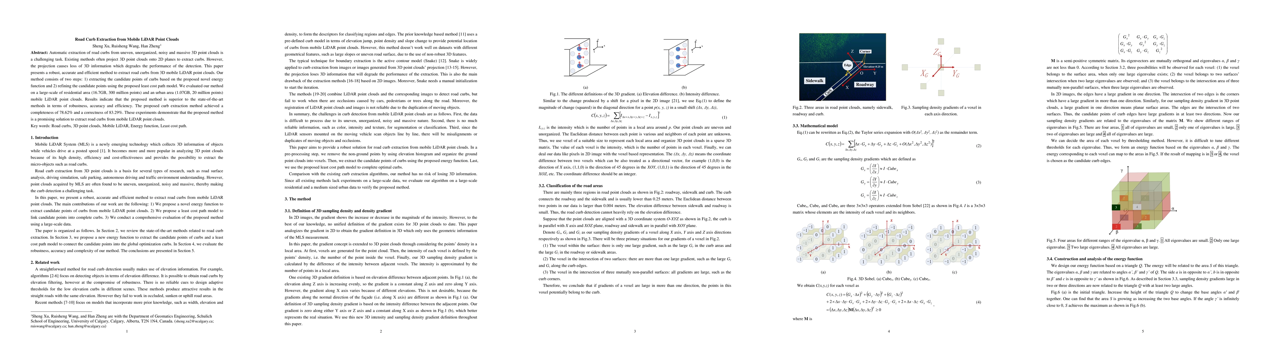 This paper proposes a novel method for extracting road curbs from 3D mobile LiDAR point clouds, avoiding the loss of 3D information through projection. The method involves extracting curb candidate points using a new energy function and refining them with a least cost path model, achieving superior robustness, accuracy, and efficiency compared to existing techniques.