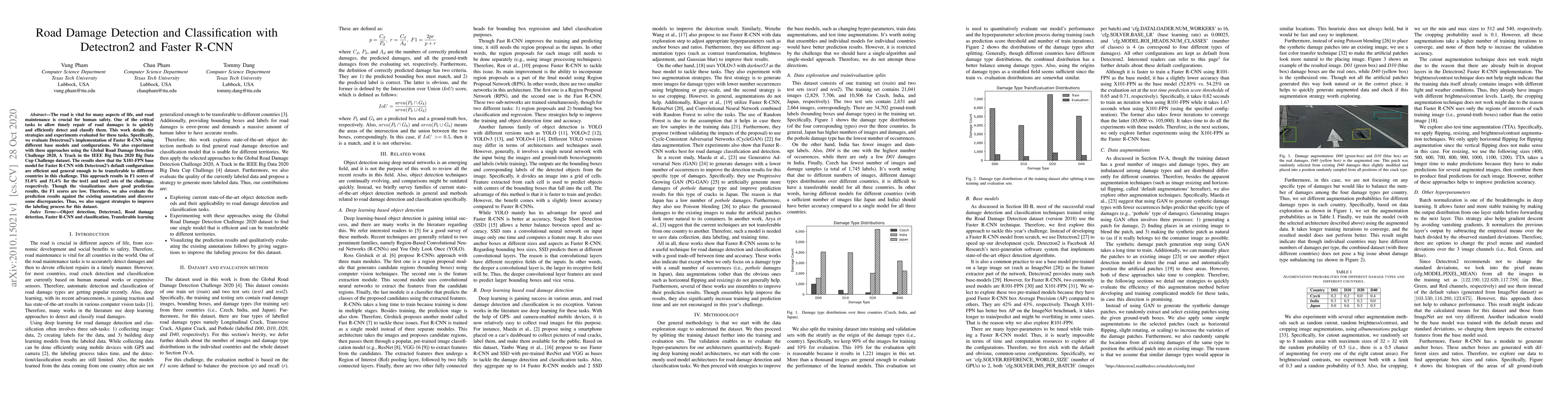This paper explores the use of Detectron2's Faster R-CNN for detecting and classifying road damage using the Global Road Damage Detection Challenge 2020 dataset. The X101-FPN base model achieved F1 scores of 51.0% and 51.4%, but the authors suggest improvements to the labeling process to enhance future results.