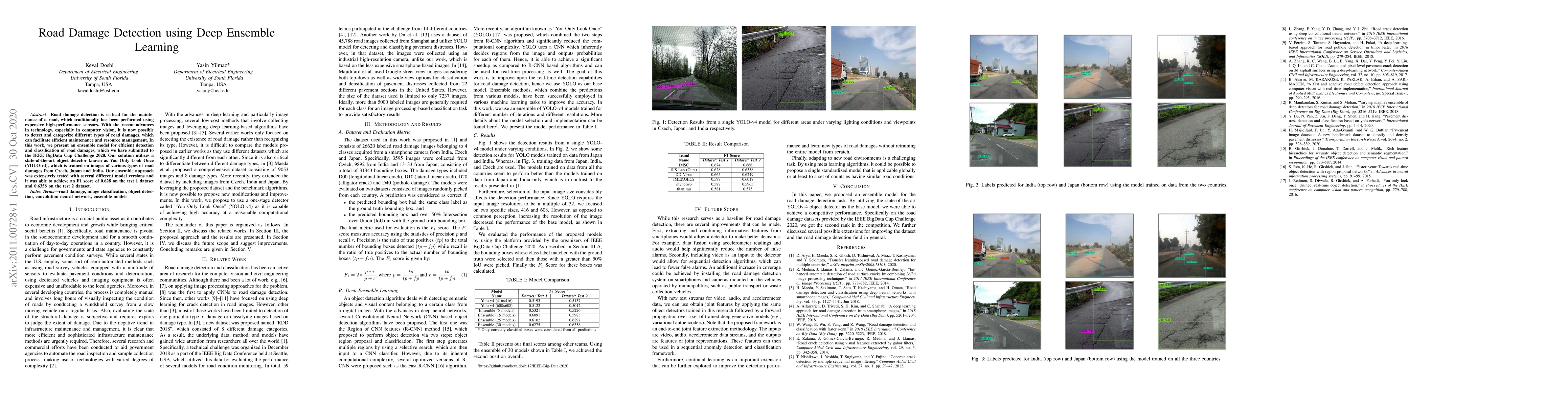 The paper proposes an ensemble deep learning model based on YOLO-v4 for efficient road damage detection and classification, achieving competitive performance in the IEEE BigData Cup Challenge 2020.
