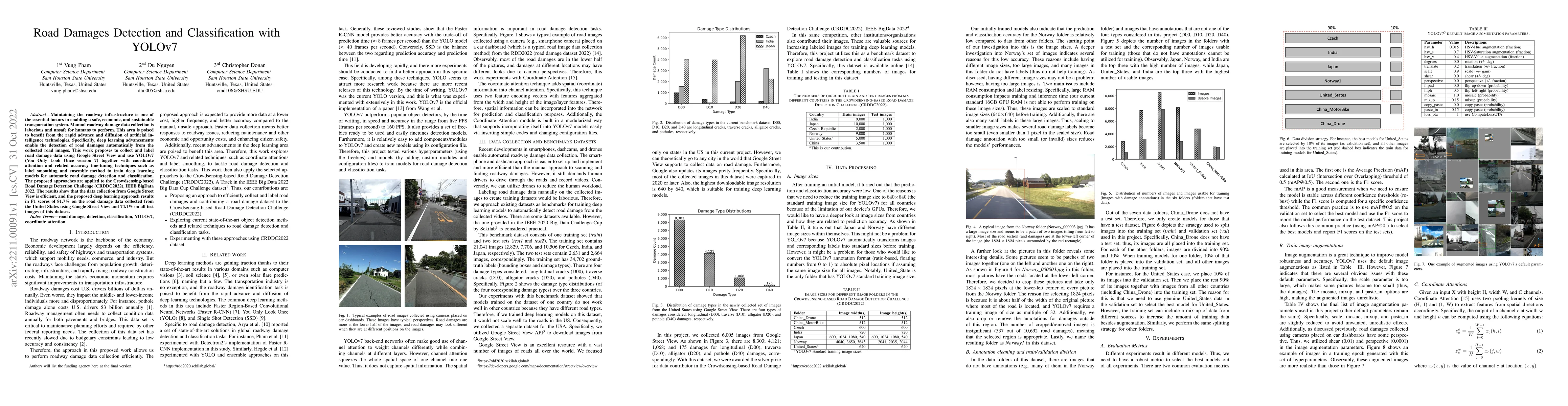 Maintaining the roadway infrastructure is one of the essential factors in enabling a safe, economic, and sustainable transportation system. Manual roadway damage data collection is laborious and unsafe for humans to perform. This area is poised to benefit from the rapid advance and diffusion of artificial intelligence technologies. Specifically, deep learning advancements enable the detection of road damages automatically from the collected road images. This work proposes to collect and label road damage data using Google Street View and use YOLOv7 (You Only Look Once version 7) together with coordinate attention and related accuracy fine-tuning techniques such as label smoothing and ensemble method to train deep learning models for automatic road damage detection and classification. The proposed approaches are applied to the Crowdsensing-based Road Damage Detection Challenge (CRDDC2022), IEEE BigData 2022. The results show that the data collection from Google Street View is efficient, and the proposed deep learning approach results in F1 scores of 81.7% on the road damage data collected from the United States using Google Street View and 74.1% on all test images of this dataset.