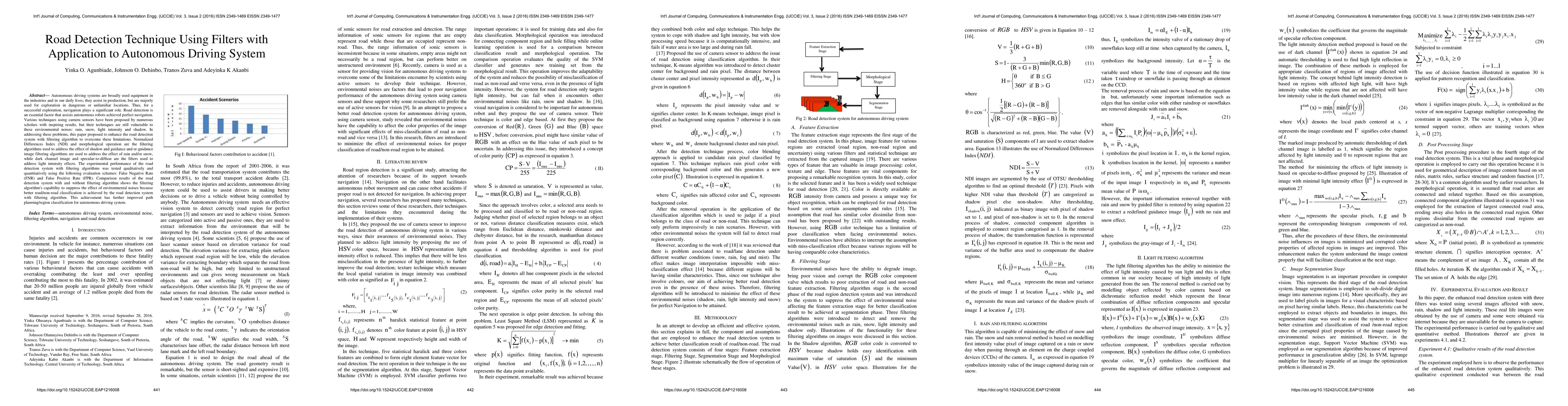 Autonomous driving systems are broadly used equipment in the industries and in our daily lives, they assist in production, but are majorly used for exploration in dangerous or unfamiliar locations. Thus, for a successful exploration, navigation plays a significant role. Road detection is an essential factor that assists autonomous robots achieved perfect navigation. Various techniques using camera sensors have been proposed by numerous scholars with inspiring results, but their techniques are still vulnerable to these environmental noises: rain, snow, light intensity and shadow. In addressing these problems, this paper proposed to enhance the road detection system with filtering algorithm to overcome these limitations. Normalized Differences Index (NDI) and morphological operation are the filtering algorithms used to address the effect of shadow and guidance and re-guidance image filtering algorithms are used to address the effect of rain and/or snow, while dark channel image and specular-to-diffuse are the filters used to address light intensity effects. The experimental performance of the road detection system with filtering algorithms was tested qualitatively and quantitatively using the following evaluation schemes: False Negative Rate (FNR) and False Positive Rate (FPR). Comparison results of the road detection system with and without filtering algorithm shows the filtering algorithm's capability to suppress the effect of environmental noises because better road/non-road classification is achieved by the road detection system. with filtering algorithm. This achievement has further improved path planning/region classification for autonomous driving system
