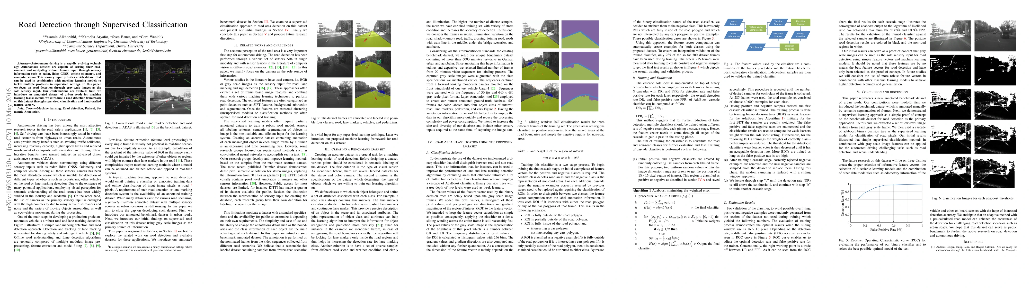 Autonomous driving is a rapidly evolving technology. Autonomous vehicles are capable of sensing their environment and navigating without human input through sensory information such as radar, lidar, GNSS, vehicle odometry, and computer vision. This sensory input provides a rich dataset that can be used in combination with machine learning models to tackle multiple problems in supervised settings. In this paper we focus on road detection through gray-scale images as the sole sensory input. Our contributions are twofold: first, we introduce an annotated dataset of urban roads for machine learning tasks; second, we introduce a road detection framework on this dataset through supervised classification and hand-crafted feature vectors.