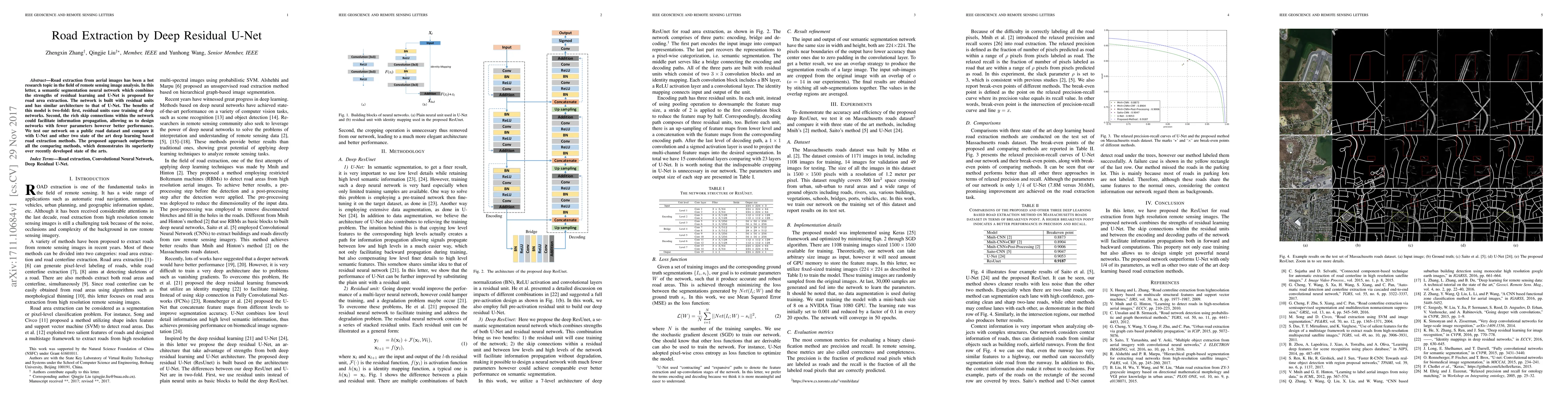 This paper proposes a Deep Residual U-Net for road extraction from aerial images, combining residual learning and U-Net architecture to ease training and enhance performance. The model outperforms other state-of-the-art methods in road extraction accuracy.