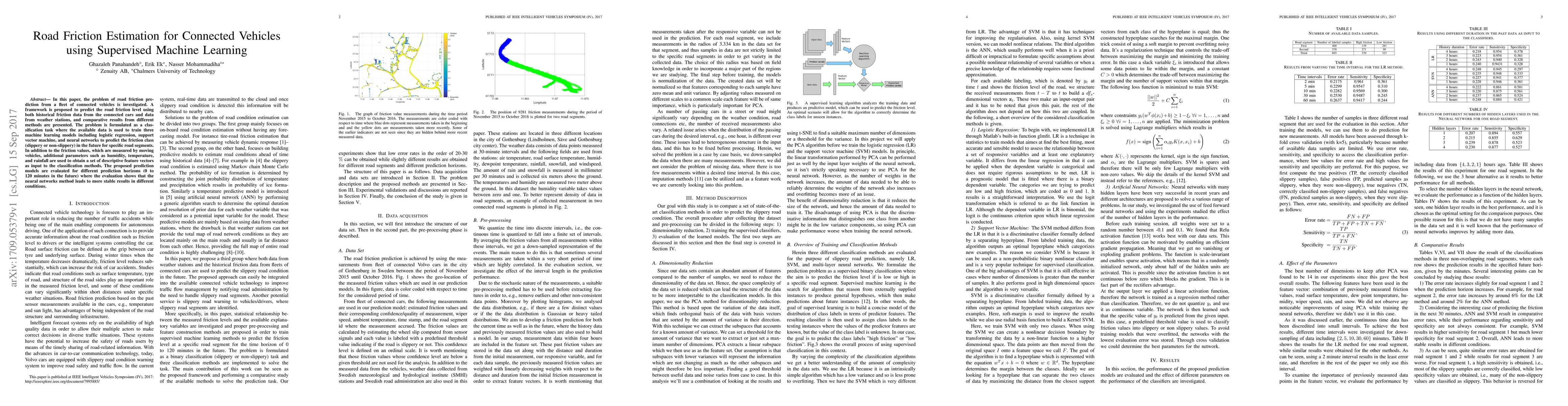 This paper proposes a framework for predicting road friction using machine learning models trained on historical data from connected vehicles and weather stations. Neural networks outperform logistic regression and support vector machines in classifying road friction as slippery or non-slippery, showing more stable results across various prediction horizons.