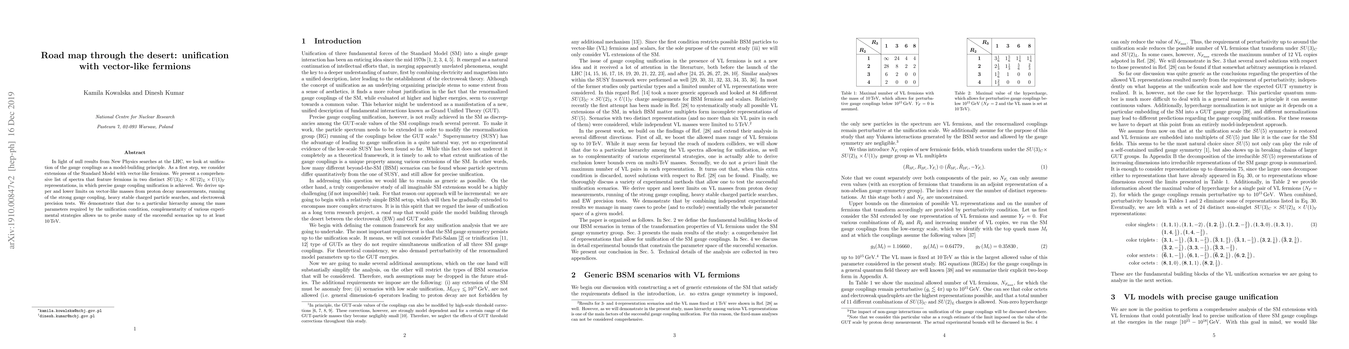In light of null results from New Physics searches at the LHC, we look at unification of the gauge couplings as a model-building principle. As a first step, we consider extensions of the Standard Model with vector-like fermions. We present a comprehensive list of spectra that feature fermions in two distinct $SU(3)_C\times SU(2)_L\times U(1)_Y$ representations, in which precise gauge coupling unification is achieved. We derive upper and lower limits on vector-like masses from proton decay measurements, running of the strong gauge coupling, heavy stable charged particle searches, and electroweak precision tests. We demonstrate that due to a particular hierarchy among the mass parameters required by the unification condition, complementarity of various experimental strategies allows us to probe many of the successful scenarios up to at least 10 TeV.