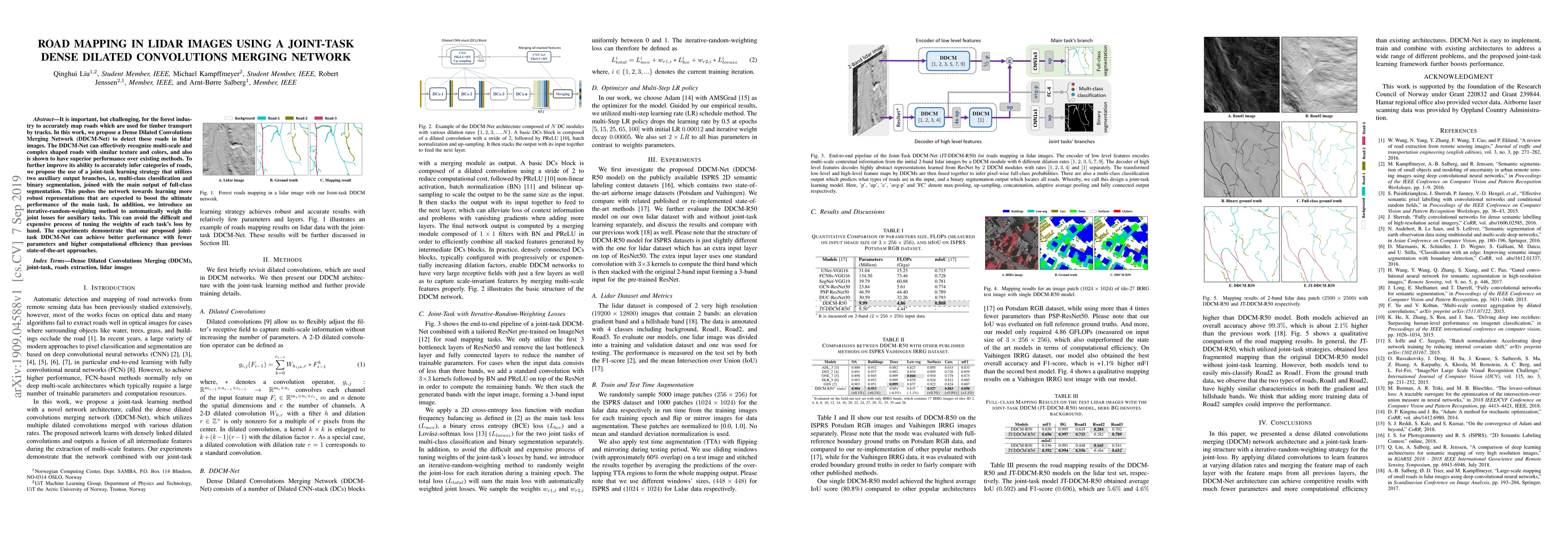 This paper proposes a Dense Dilated Convolutions Merging Network (DDCM-Net) for detecting roads in LiDAR images, utilizing joint-task learning with auxiliary branches for multi-class classification and binary segmentation to enhance road recognition. The method achieves superior performance and higher computational efficiency compared to existing techniques.