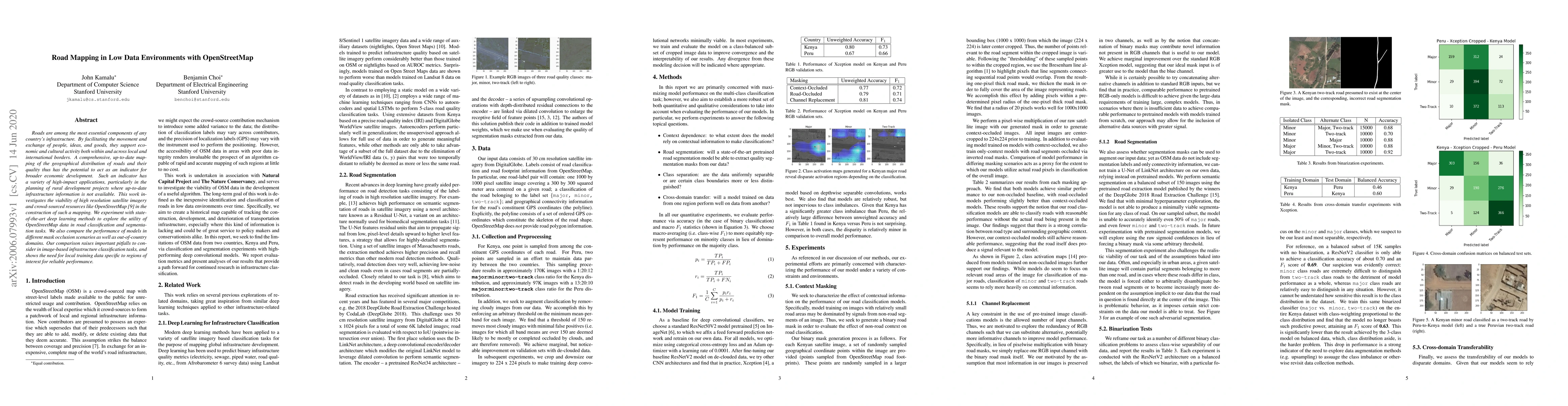 This paper explores the use of high-resolution satellite imagery and OpenStreetMap data to create road maps in low data environments, employing deep learning for road classification and segmentation. It highlights the importance of local training data for reliable performance and identifies challenges in image-based infrastructure classification.