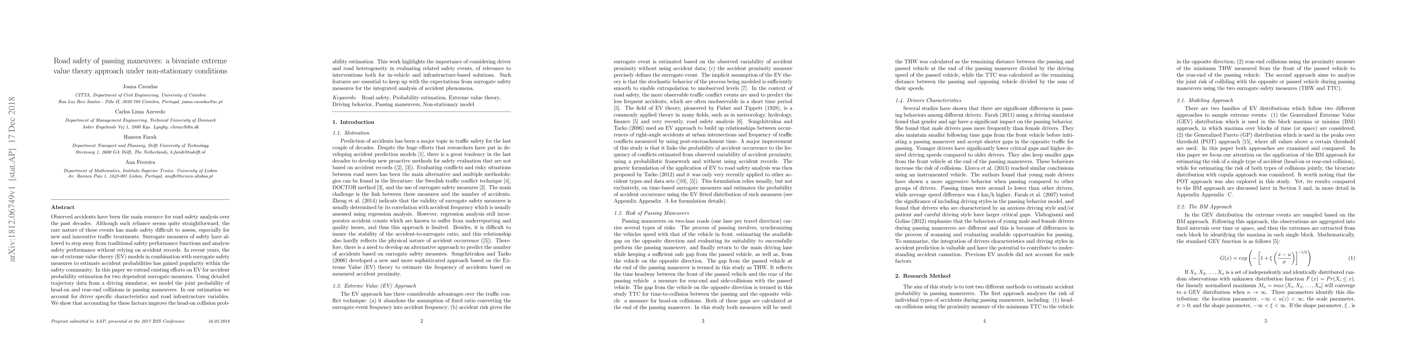 This paper employs bivariate extreme value theory to model the joint probability of head-on and rear-end collisions during passing maneuvers, using surrogate safety measures and detailed driving simulator data. It highlights the importance of driver and road heterogeneity in improving safety estimations, relevant for both in-vehicle and infrastructure-based safety interventions.