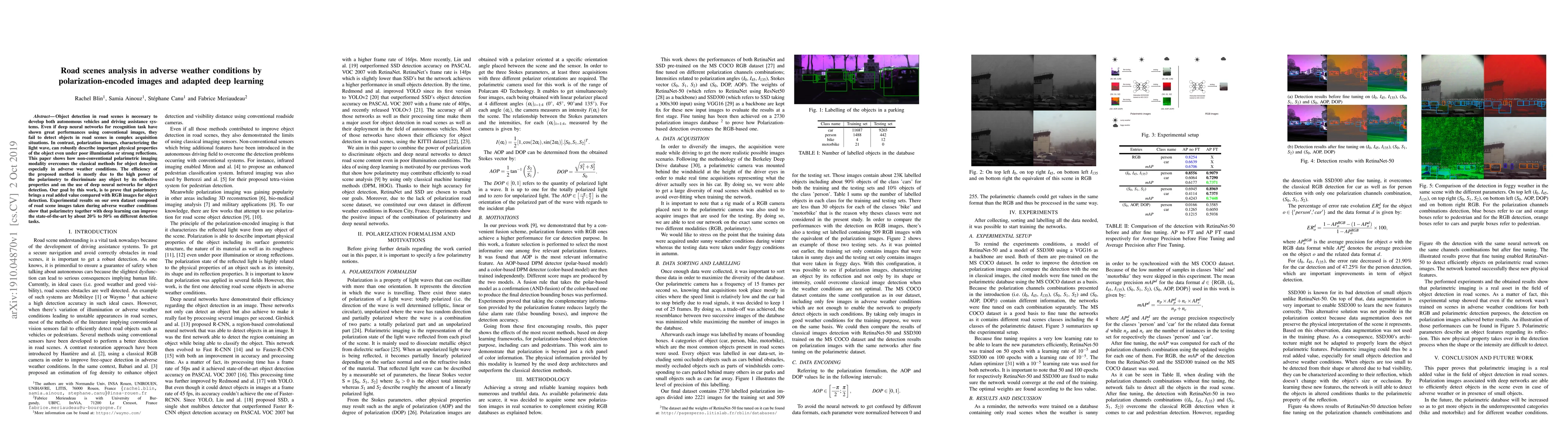 This paper proposes a method using polarization-encoded images and adapted deep learning to enhance object detection in adverse weather conditions. Polarimetry, which characterizes light waves, provides robust object detection even under poor illumination or strong reflections, outperforming conventional methods and improving detection accuracy by 20% to 50%.