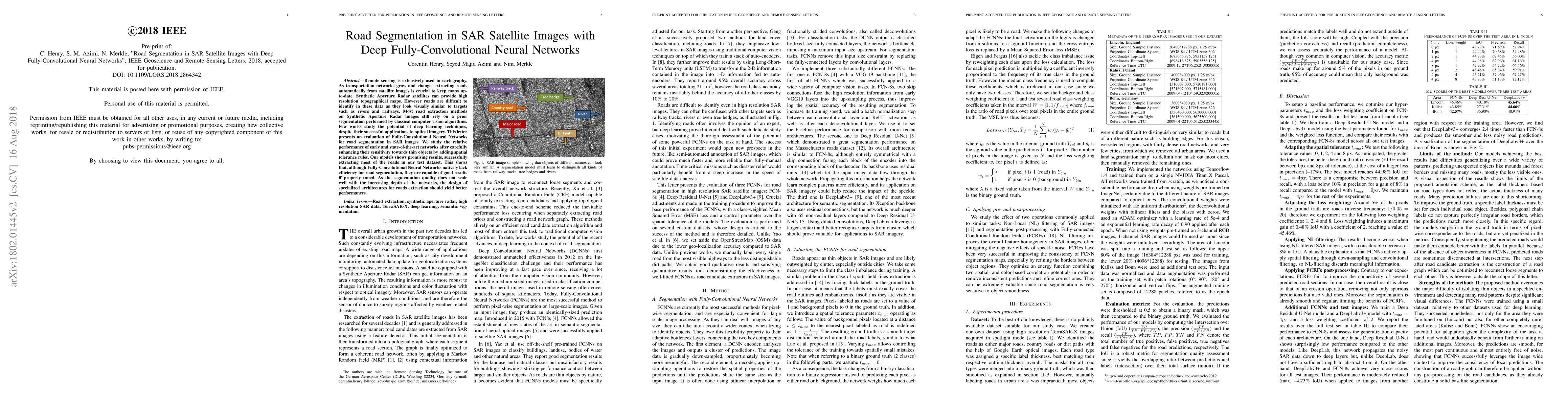 This paper evaluates Fully-Convolutional Neural Networks for road segmentation in Synthetic Aperture Radar (SAR) satellite images, demonstrating that with proper tuning, these networks can yield promising results despite their inherent limitations. The study suggests that specialized architectures may provide even better performance for this task.