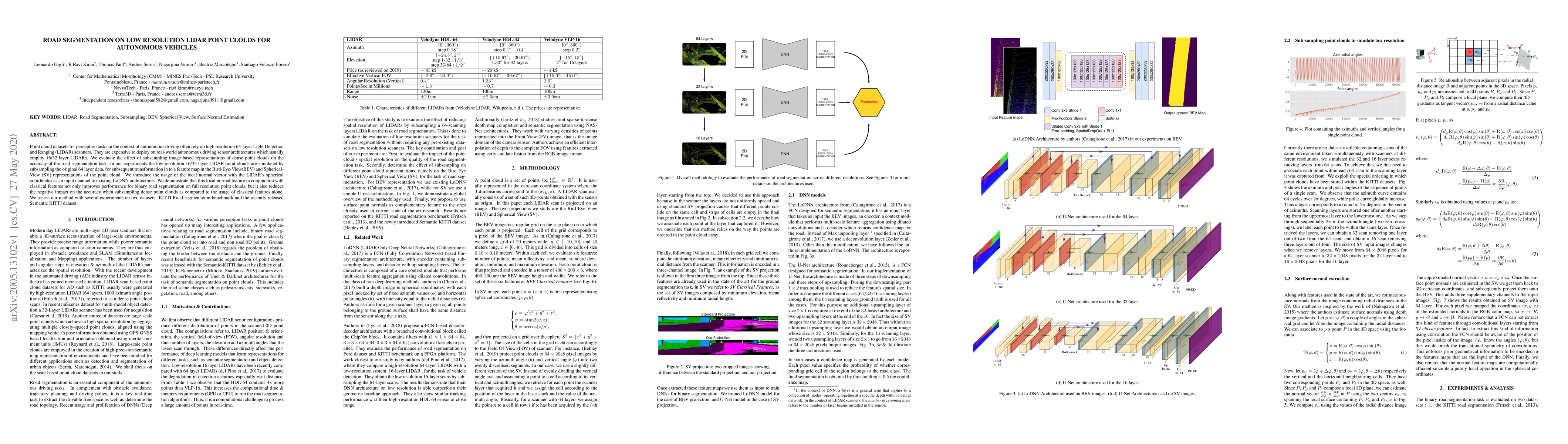 This paper investigates the impact of subsampling high-resolution LIDAR point clouds to low resolution (16/32 layers) on road segmentation accuracy for autonomous vehicles. It introduces a local normal vector feature in LIDAR's spherical coordinates to enhance segmentation performance, demonstrating improved results compared to classical features alone.