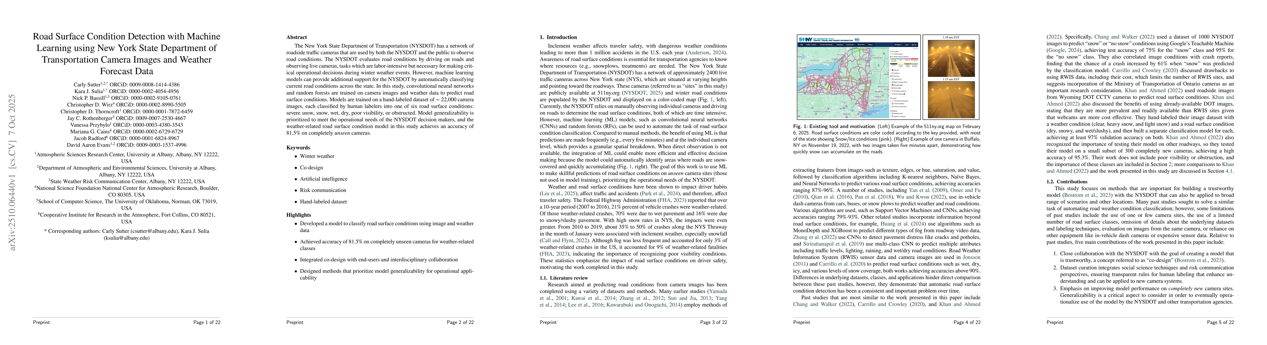 The New York State Department of Transportation (NYSDOT) has a network of roadside traffic cameras that are used by both the NYSDOT and the public to observe road conditions. The NYSDOT evaluates road conditions by driving on roads and observing live cameras, tasks which are labor-intensive but necessary for making critical operational decisions during winter weather events. However, machine learning models can provide additional support for the NYSDOT by automatically classifying current road conditions across the state. In this study, convolutional neural networks and random forests are trained on camera images and weather data to predict road surface conditions. Models are trained on a hand-labeled dataset of ~22,000 camera images, each classified by human labelers into one of six road surface conditions: severe snow, snow, wet, dry, poor visibility, or obstructed. Model generalizability is prioritized to meet the operational needs of the NYSDOT decision makers, and the weather-related road surface condition model in this study achieves an accuracy of 81.5% on completely unseen cameras.