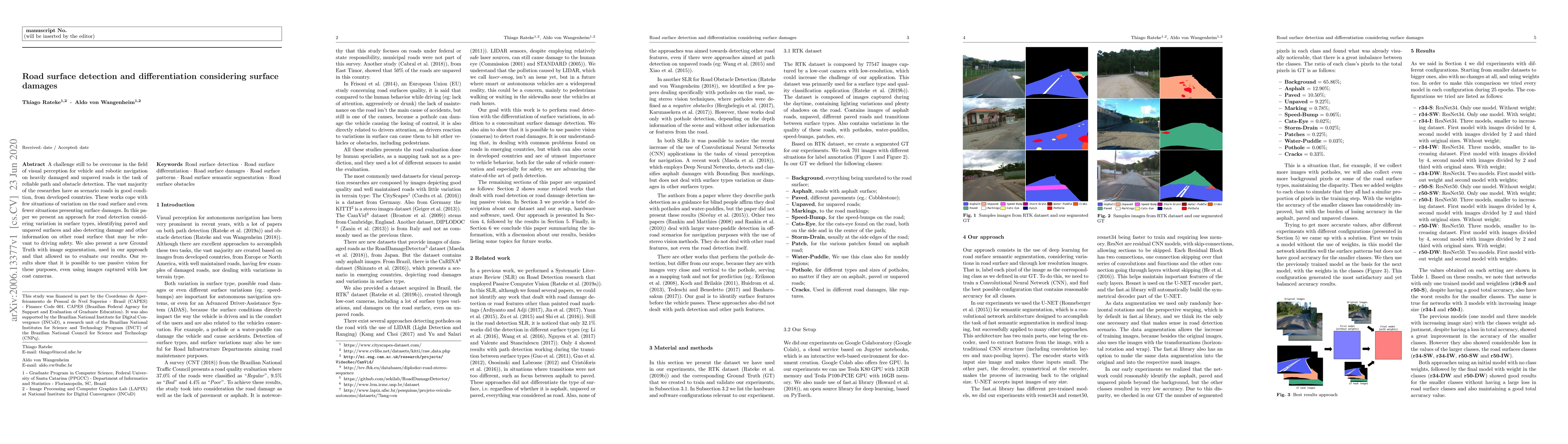 A challenge still to be overcome in the field of visual perception for vehicle and robotic navigation on heavily damaged and unpaved roads is the task of reliable path and obstacle detection. The vast majority of the researches have as scenario roads in good condition, from developed countries. These works cope with few situations of variation on the road surface and even fewer situations presenting surface damages. In this paper we present an approach for road detection considering variation in surface types, identifying paved and unpaved surfaces and also detecting damage and other information on other road surface that may be relevant to driving safety. We also present a new Ground Truth with image segmentation, used in our approach and that allowed us to evaluate our results. Our results show that it is possible to use passive vision for these purposes, even using images captured with low cost cameras.