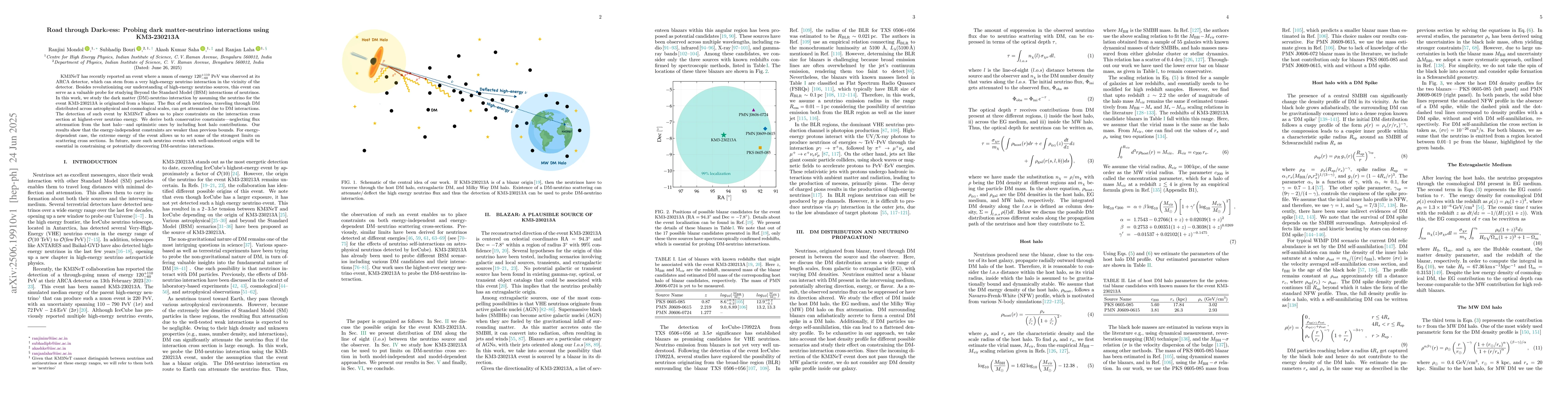 KM3NeT has recently reported an event where a muon of energy $120^{+110}_{-60}$ PeV was observed at its ARCA detector, which can stem from a very high-energy neutrino interaction in the vicinity of the detector. Besides revolutionizing our understanding of high-energy neutrino sources, this event can serve as a valuable probe for studying Beyond the Standard Model (BSM) interactions of neutrinos. In this work, we study the dark matter (DM)-neutrino interaction by assuming the neutrino for the event KM3-230213A is originated from a blazar. The flux of such neutrinos, traveling through DM distributed across astrophysical and cosmological scales, can get attenuated due to DM interactions. The detection of such event by KM3NeT allows us to place constraints on the interaction cross section at highest-ever neutrino energy. We derive both conservative constraints-neglecting flux attenuation from the host halo-and optimistic ones by including host halo contributions. Our results show that the energy-independent constraints are weaker than previous bounds. For energy-dependent case, the extreme energy of the event allows us to set some of the strongest limits on scattering cross sections. In future, more such neutrino events with well-understood origin will be essential in constraining or potentially discovering DM-neutrino interactions.
