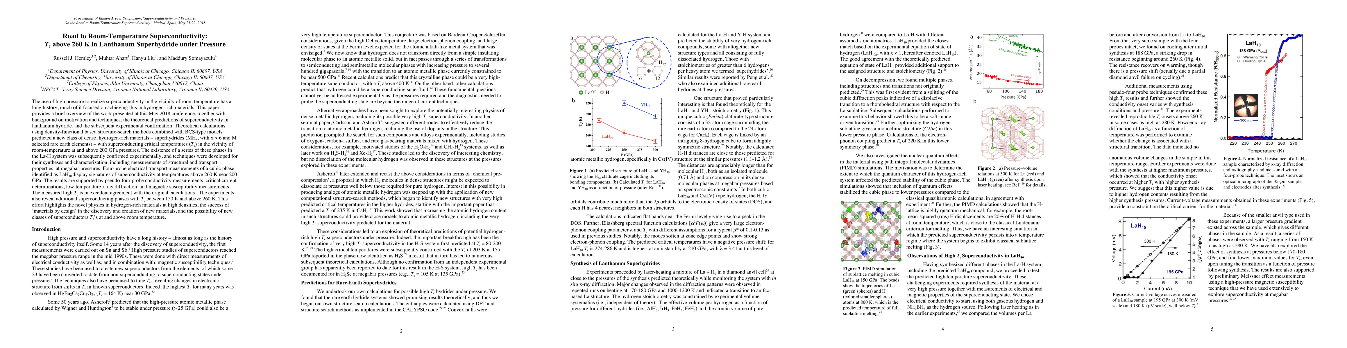 The use of high pressure to realize superconductivity in the vicinity of room temperature has a long history, much of it focused on achieving this in hydrogen rich materials. This paper provides a brief overview of the work presented at this May 2018 conference, together with background on motivation and techniques, the theoretical predictions of superconductivity in lanthanum hydride, and the subsequent experimental confirmation. Theoretical calculations using density functional based structure search methods combined with BCS type models predicted a new class of dense, hydrogen rich materials superhydrides with superconducting critical temperatures in the vicinity of room temperature at and above 200 GPa pressures. The existence of a series of these phases in the La H system was subsequently confirmed experimentally, and techniques were developed for their syntheses and characterization, including measurements of structural and transport properties, at megabar pressures. Four probe electrical transport measurements of a cubic phase identified as LaH10 display signatures of superconductivity at temperatures above 260 K near 200 GPa. The results are supported by pseudo four probe conductivity measurements, critical current determinations, low-temperature xray diffraction, and magnetic susceptibility measurements. The measured high Tc is in excellent agreement with the original calculations. The experiments also reveal additional superconducting phases with Tc between 150 K and above 260 K. This effort highlights the novel physics in hydrogen-rich materials at high densities, the success of materials by design in the discovery and creation of new materials, and the possibility of new classes of superconductors Tc at and above room temperature.