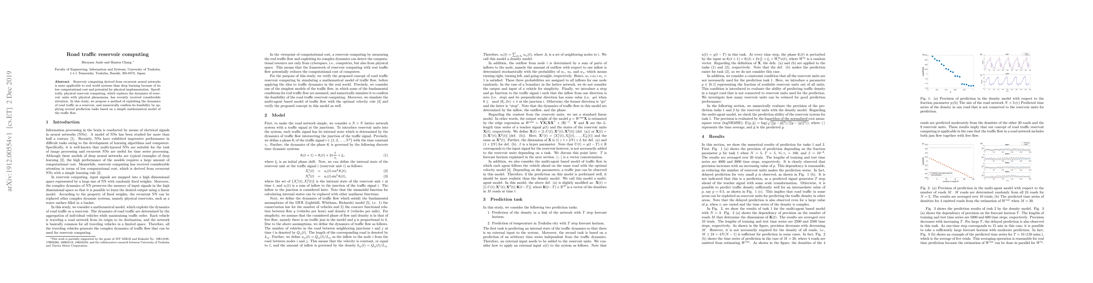This paper explores the application of reservoir computing to road traffic dynamics, proposing a method that uses traffic flow as a physical reservoir for computation. The study demonstrates the feasibility of this approach through numerical simulations of prediction tasks based on a simplified traffic model.