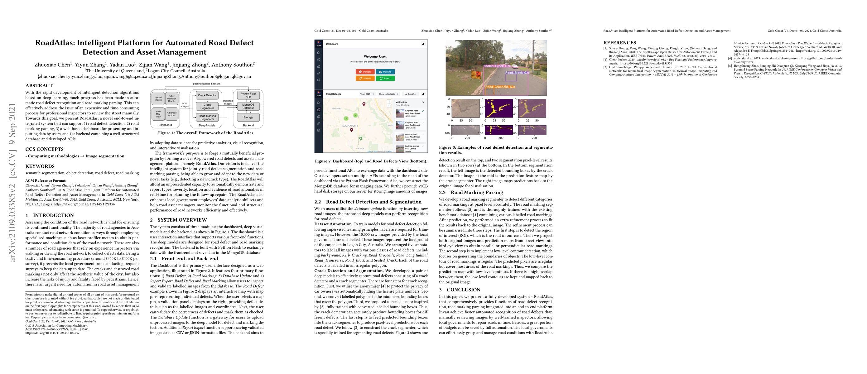 The paper introduces RoadAtlas, an integrated system utilizing deep learning for automated road defect detection and road marking parsing, offering a user-friendly web dashboard and a structured database for efficient asset management.