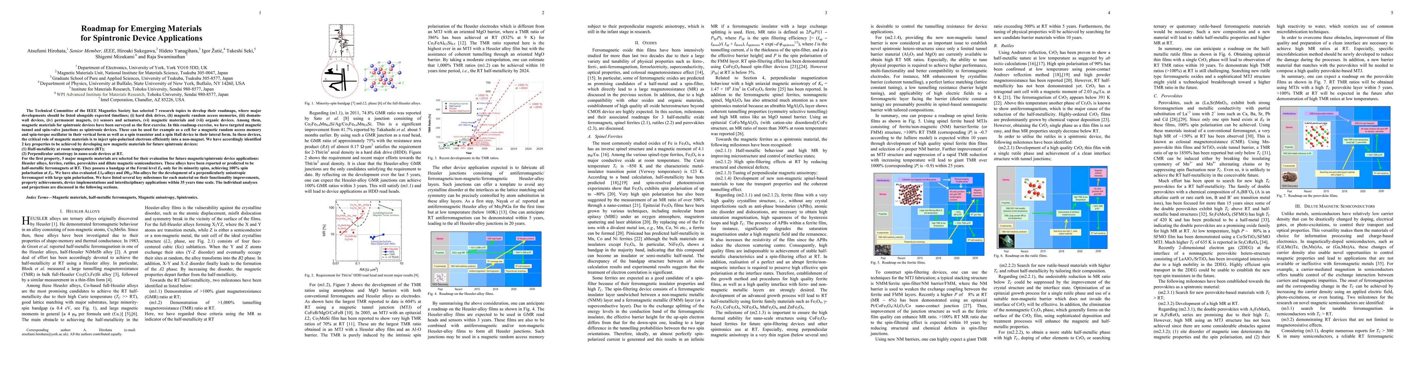 The paper outlines a roadmap for emerging materials in spintronic devices, focusing on magnetic materials for tunnel and spin-valve junctions. It identifies key properties and materials for future development, including half-metallicity at room temperature and perpendicular anisotropy in nano-scale devices.