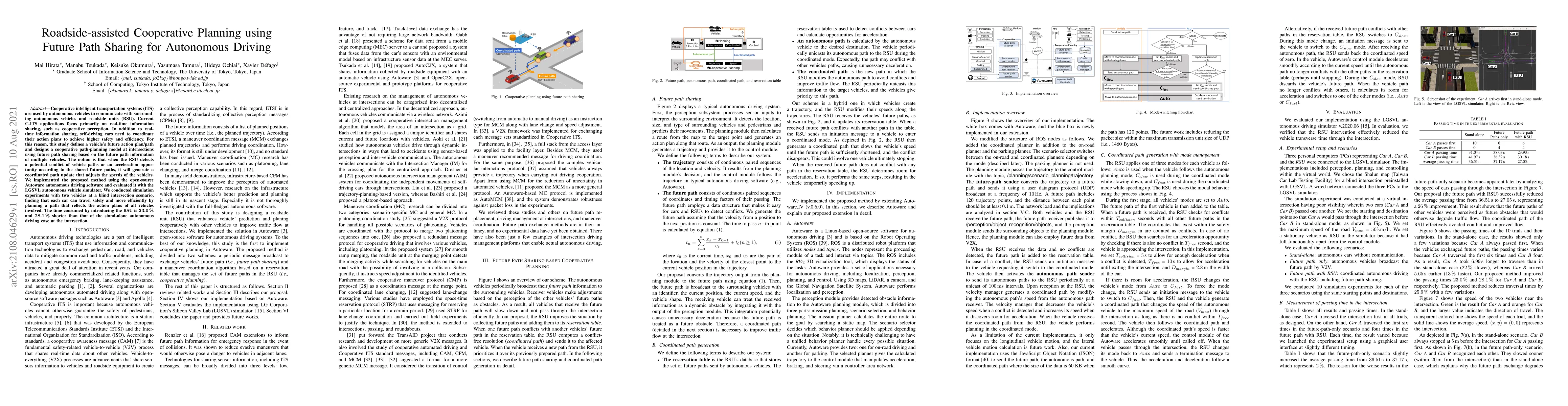 This study proposes a cooperative path-planning model for autonomous vehicles using future path sharing with roadside units (RSU) to enhance safety and efficiency at intersections. Simulation results show that the method enables safer and more efficient travel by coordinating vehicle speeds based on shared future paths, reducing travel time by 23.0% to 28.1% compared to standalone autonomous driving.