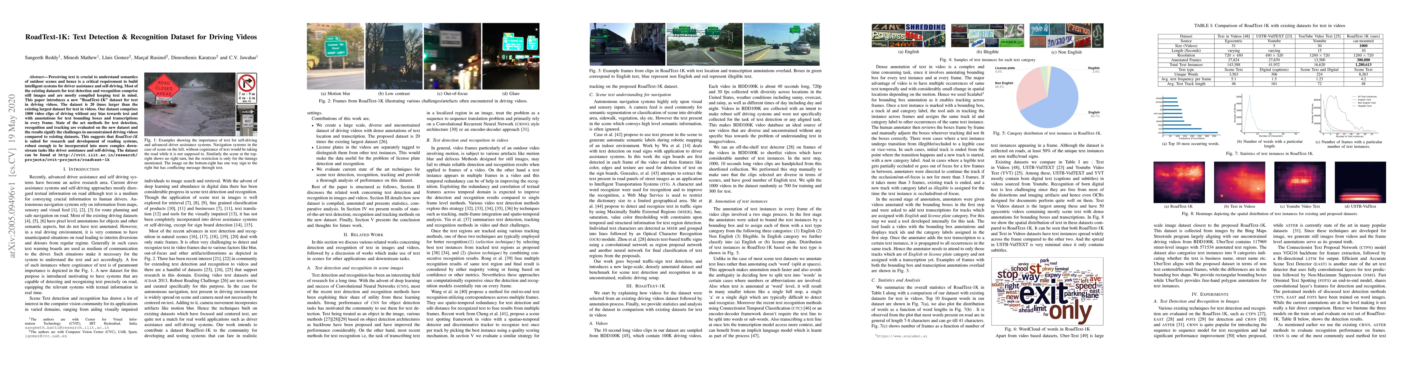 The "RoadText-1K" dataset introduces 1000 driving video clips for text detection and recognition, significantly larger than existing video-based datasets. It evaluates state-of-the-art methods, highlighting challenges in unconstrained driving scenarios and supporting research in driver assistance and self-driving technologies.
