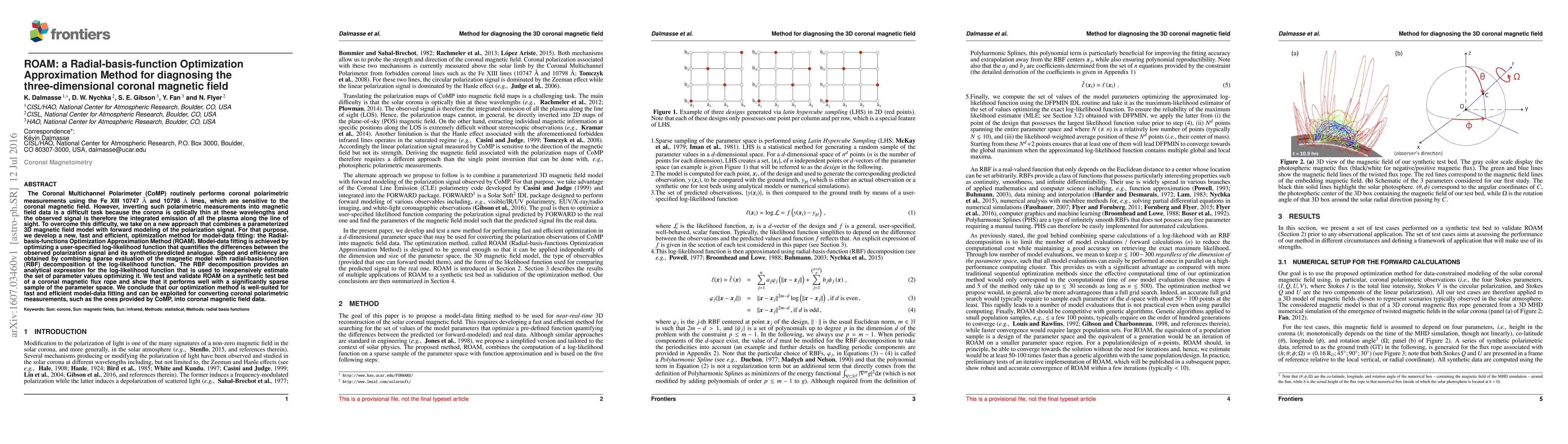 The paper introduces ROAM, a Radial-basis-function Optimization Approximation Method for diagnosing the three-dimensional coronal magnetic field, which combines a parameterized 3D magnetic field model with forward modeling to efficiently fit observed polarimetric data. ROAM optimizes a log-likelihood function using sparse evaluation and radial-basis-function decomposition, enabling fast and accurate model-data fitting.