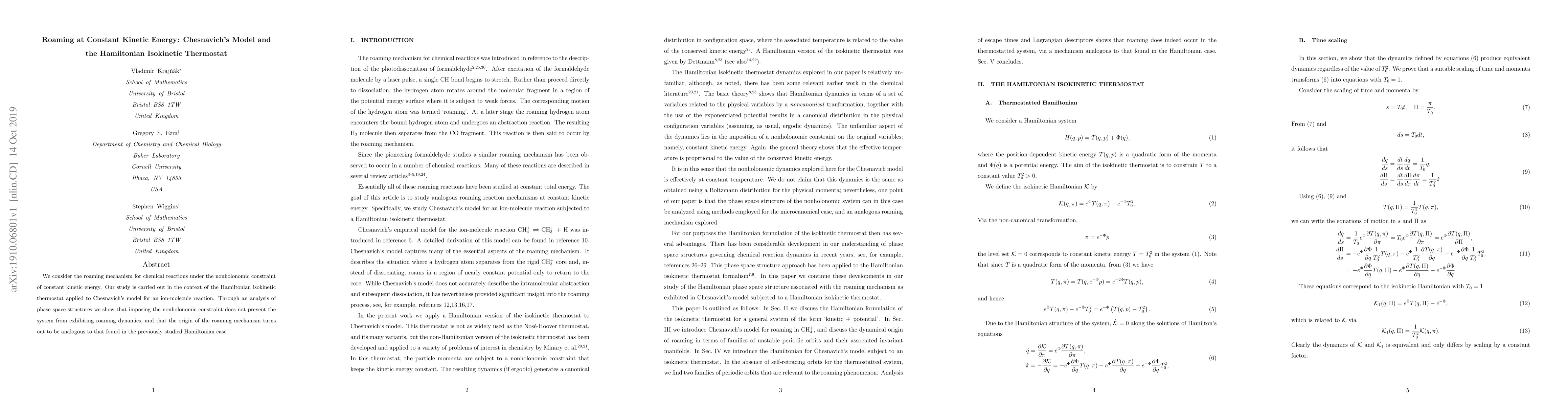 This paper investigates roaming dynamics in chemical reactions under a constant kinetic energy constraint using Chesnavich's model and the Hamiltonian isokinetic thermostat. The study reveals that the nonholonomic constraint does not hinder roaming dynamics, and the underlying mechanism is similar to that observed in the Hamiltonian case.