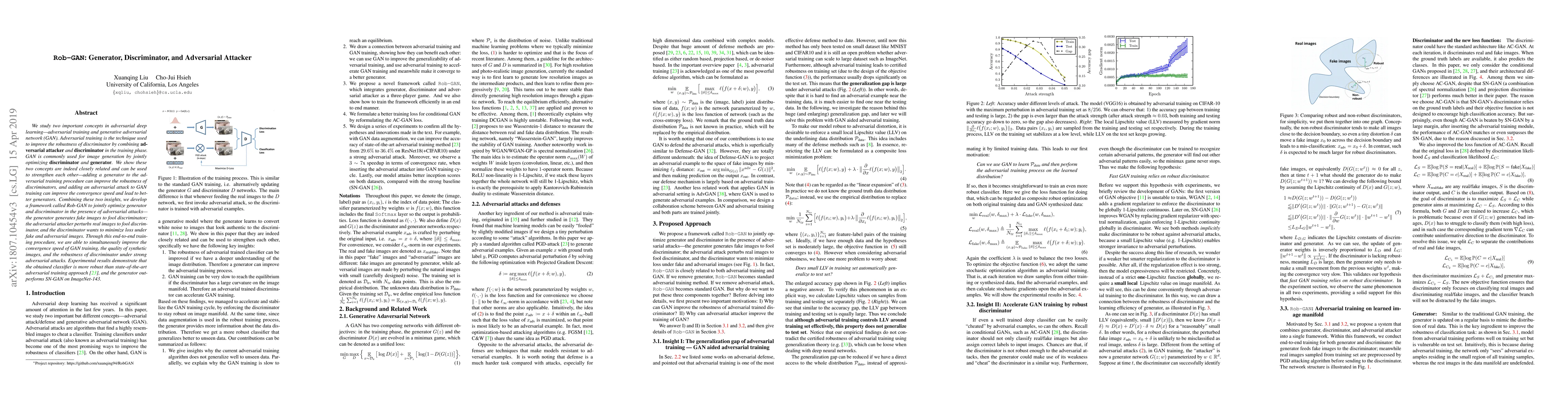 Rob-GAN integrates adversarial training and GANs to enhance discriminator robustness and generator quality. By jointly optimizing a generator, discriminator, and adversarial attacker, the framework improves GAN convergence speed and synthetic image quality while boosting discriminator resilience to adversarial attacks.