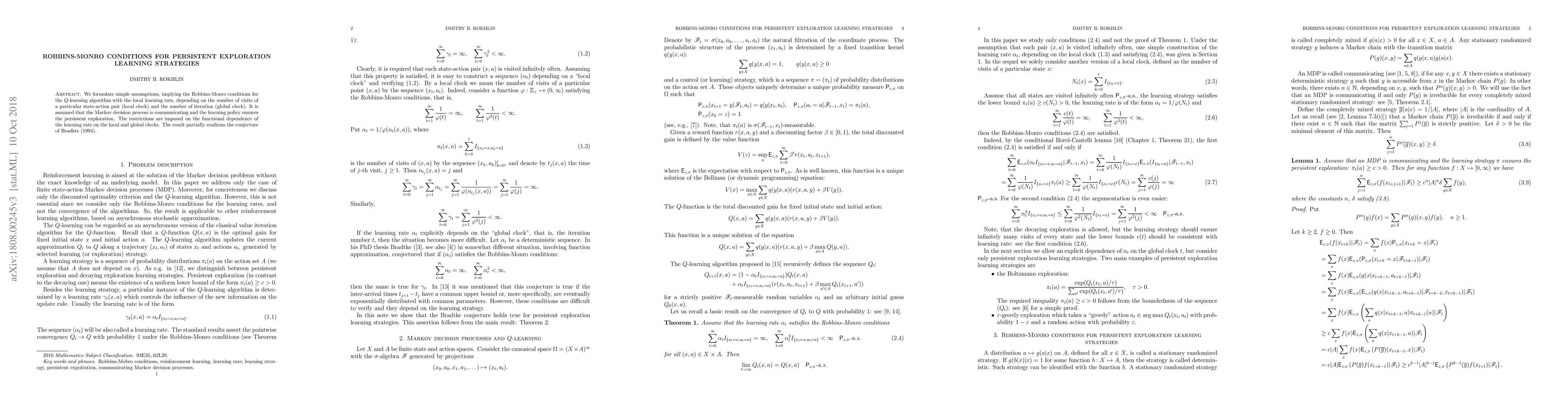 We formulate simple assumptions, implying the Robbins-Monro conditions for the $Q$-learning algorithm with the local learning rate, depending on the number of visits of a particular state-action pair (local clock) and the number of iteration (global clock). It is assumed that the Markov decision process is communicating and the learning policy ensures the persistent exploration. The restrictions are imposed on the functional dependence of the learning rate on the local and global clocks. The result partially confirms the conjecture of Bradkte (1994).