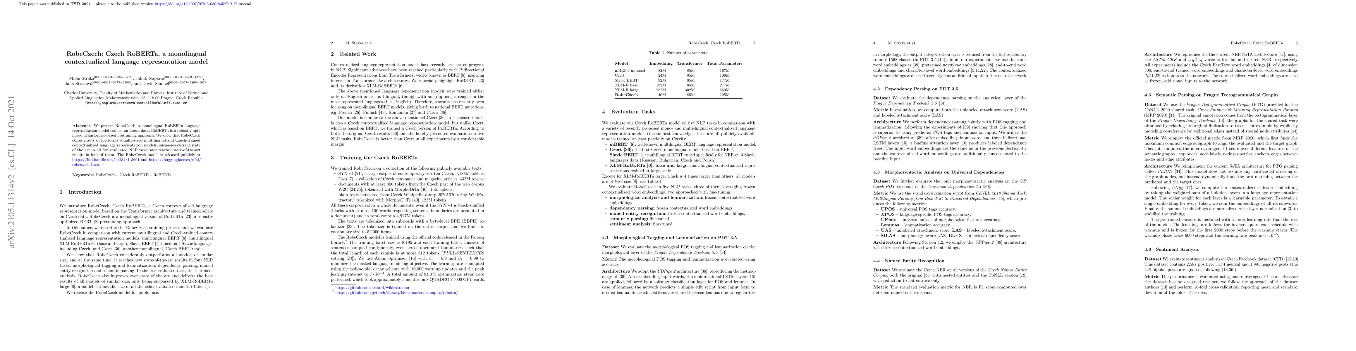 RobeCzech is a Czech-specific RoBERTa model that outperforms multilingual and Czech-trained models in five NLP tasks, achieving state-of-the-art results in four of them. The model is publicly available for further research.