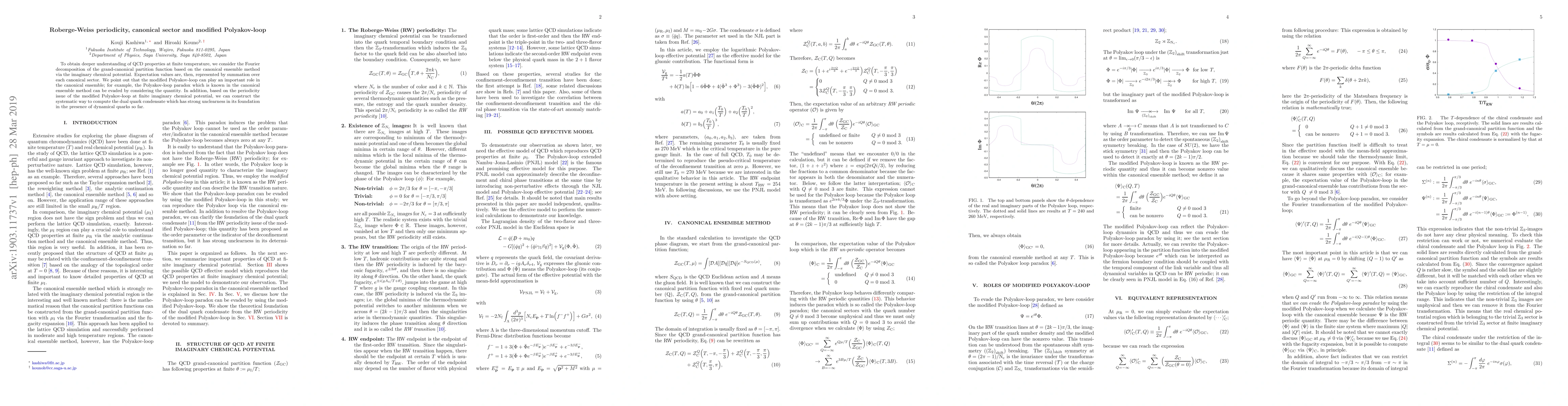 This paper explores the Roberge-Weiss periodicity and its implications for the canonical ensemble in finite temperature QCD, emphasizing the modified Polyakov-loop's role in resolving the Polyakov-loop paradox and providing a systematic approach to compute the dual quark condensate.
