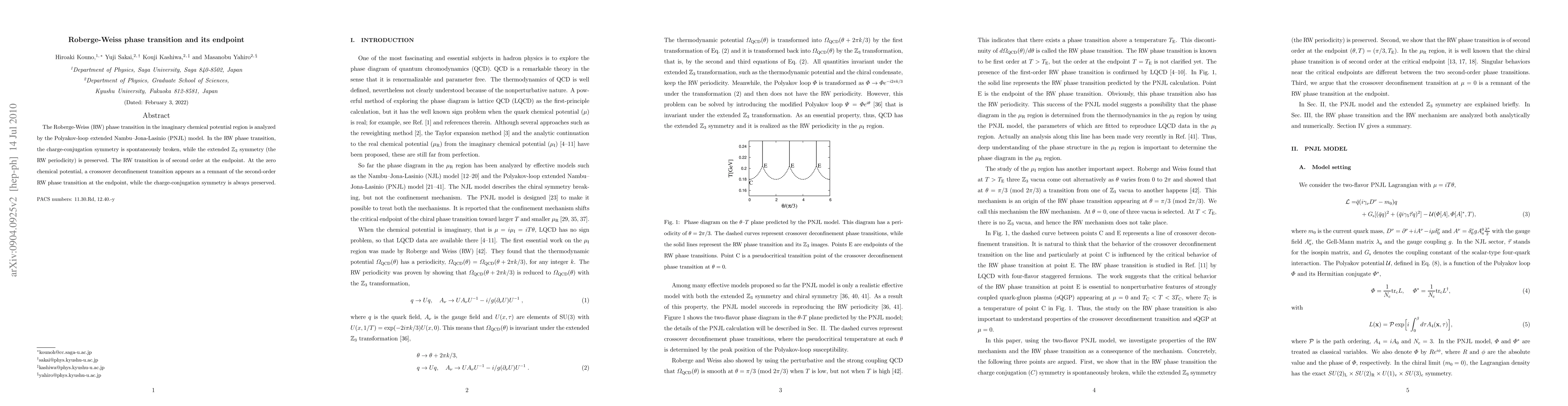 The Roberge-Weiss phase transition in the imaginary chemical potential region is analyzed using the PNJL model, showing a second-order transition at its endpoint, where charge-conjugation symmetry is broken, but extended Z3 symmetry is preserved; at zero chemical potential, a crossover deconfinement transition occurs.
