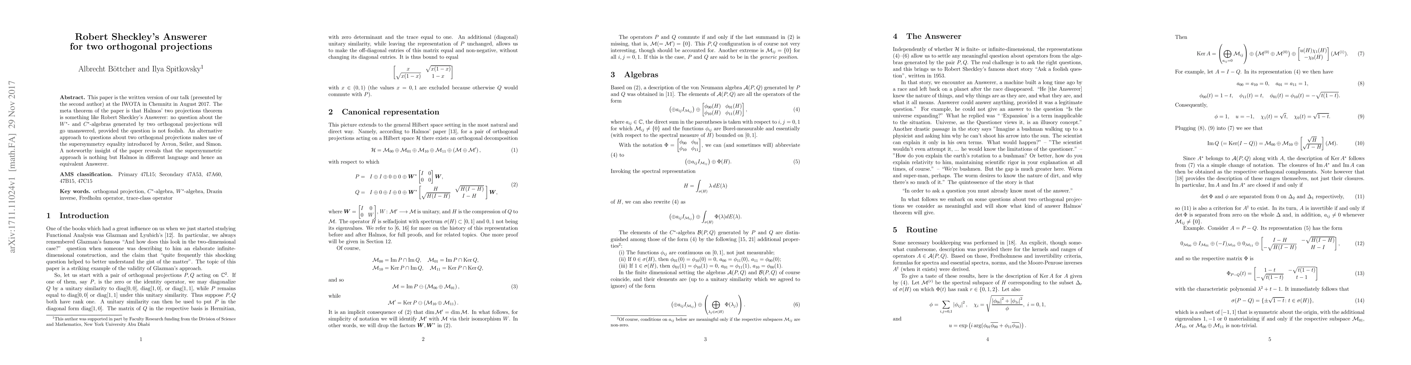 This paper is the written version of our talk (presented by the second author) at the IWOTA in Chemnitz in August 2017. The meta theorem of the paper is that Halmos' two projections theorem is something like Robert Sheckley's Answerer: no question about the W*- and C*-algebras generated by two orthogonal projections will go unanswered, provided the question is not foolish. An alternative approach to questions about two orthogonal projections makes use of the supersymmetry equality introduced by Avron, Seiler, and Simon. A noteworthy insight of the paper reveals that the supersymmetric approach is nothing but Halmos in different language and hence an equivalent Answerer.
