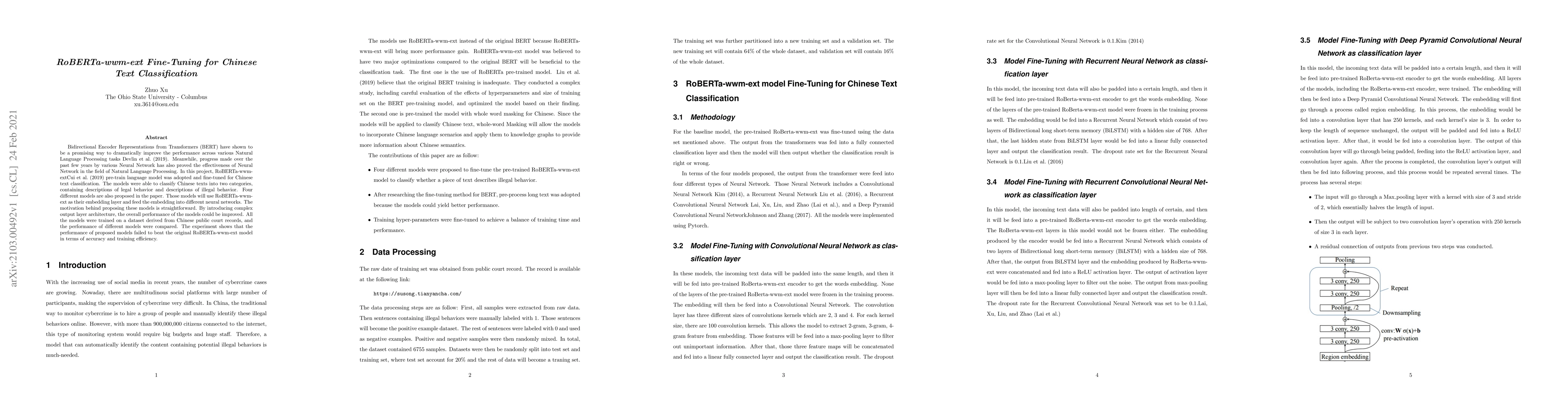Bidirectional Encoder Representations from Transformers (BERT) have shown to be a promising way to dramatically improve the performance across various Natural Language Processing tasks [Devlin et al., 2019]. Meanwhile, progress made over the past few years by various Neural Net-work has also proved the effectiveness of Neural Network in the field of Natural Language Processing. In this project, RoBERTa-wwm-ext [Cui et al., 2019] pre-train language model was adopted and fine-tuned for Chinese text classification. The models were able to classify Chinese texts into two categories, containing descriptions of legal behavior and descriptions of illegal behavior. Four different models are also proposed in the paper. Those models will use RoBERTa-wwm-extas their embedding layer and feed the embedding into different neural networks. The motivation be-hind proposing these models is straightforward. By introducing complex output layer architecture, the overall performance of the models could be improved. All the models were trained on a data set derived from Chinese public court records, and the performance of different models were compared.The experiment shows that the performance of pro-posed models failed to beat the original RoBERTa-wwm-ext model in terms of accuracy and training efficiency.