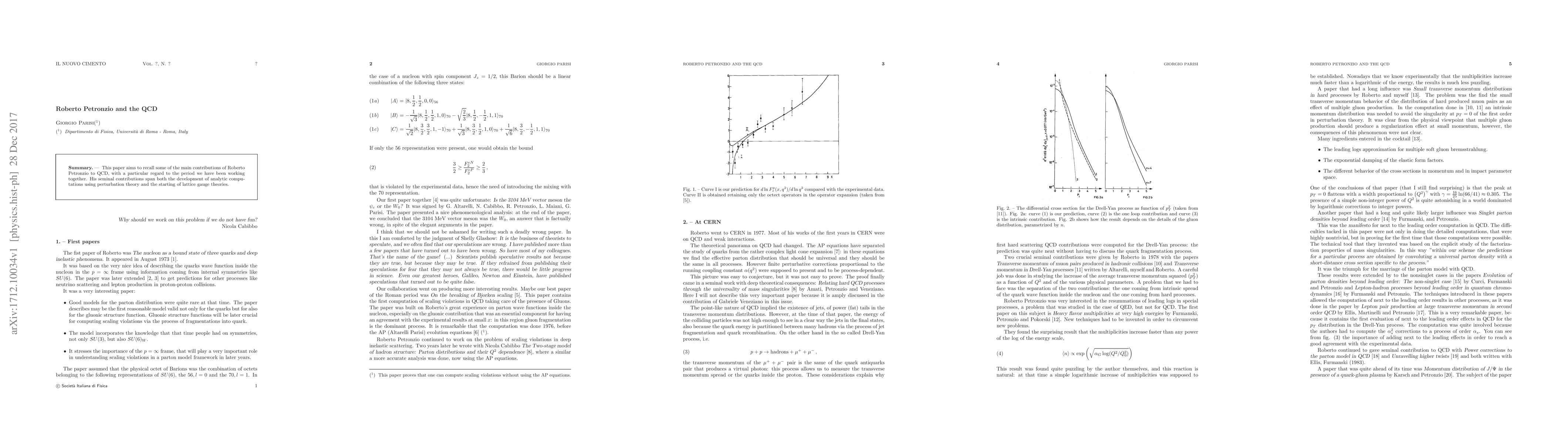 This paper aims to recall some of the main contributions of Roberto Petronzio to QCD, with a particular regard to the period we have been working together. His seminal contributions span both the development of analytic computations using perturbation theory and the starting of lattice gauge theories.