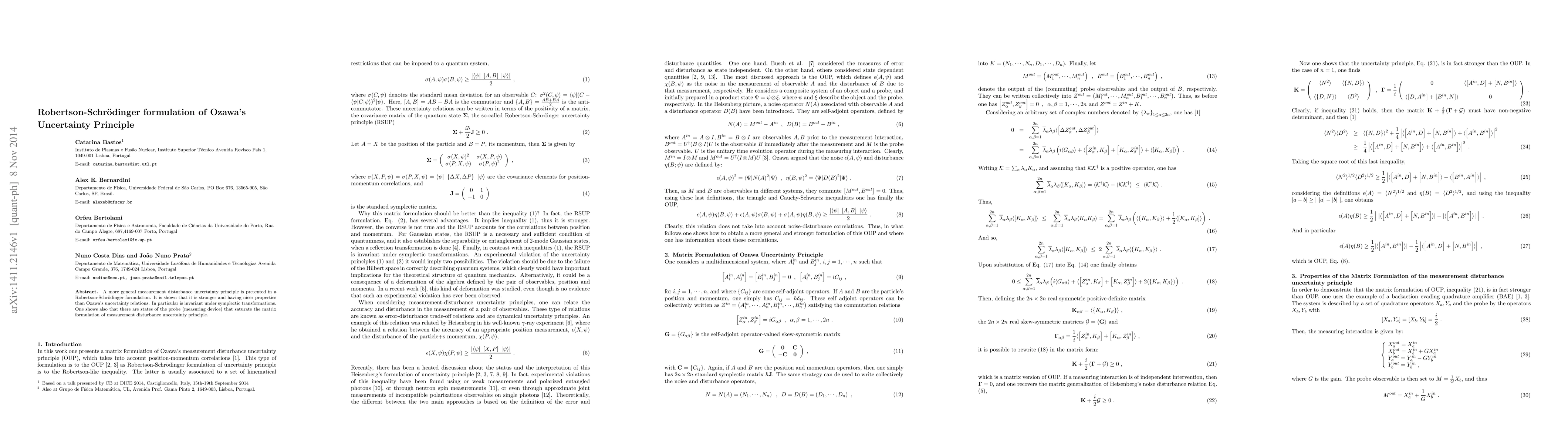 This paper presents a more general Robertson-Schrödinger formulation of Ozawa's uncertainty principle, demonstrating its stronger properties and invariance under symplectic transformations. It also identifies probe states that achieve the principle's matrix formulation.