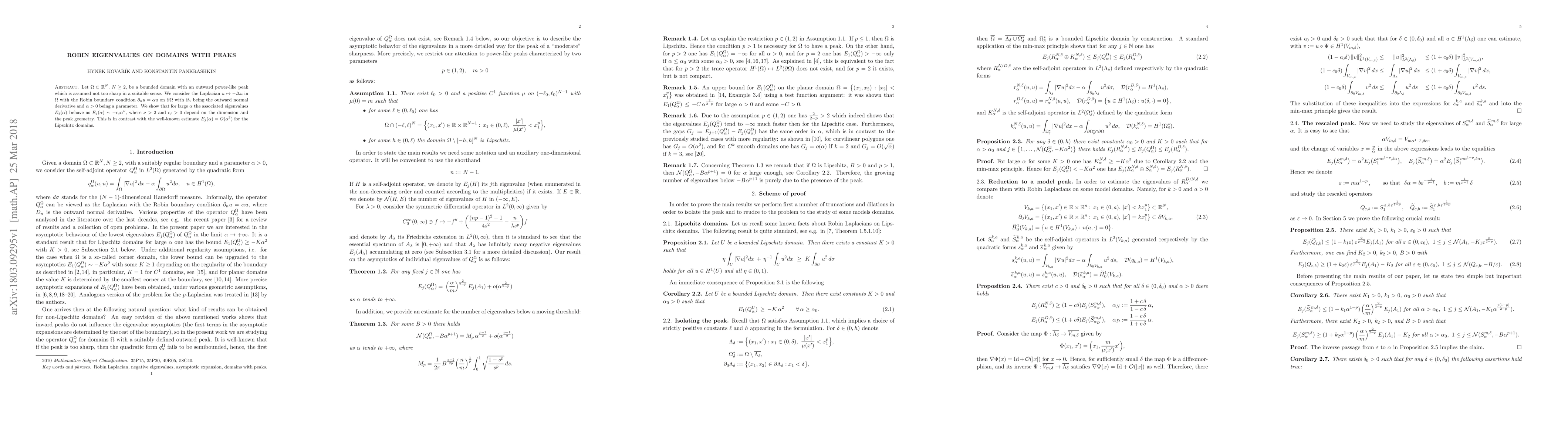 This paper investigates the behavior of Robin eigenvalues for the Laplacian in domains with outward power-like peaks, showing that for large parameters, the eigenvalues scale as $E_j(\alpha)\sim -\epsilon_j \alpha^\nu$ with $\nu>2$, contrasting with the $O(\alpha^2)$ scaling in Lipschitz domains.