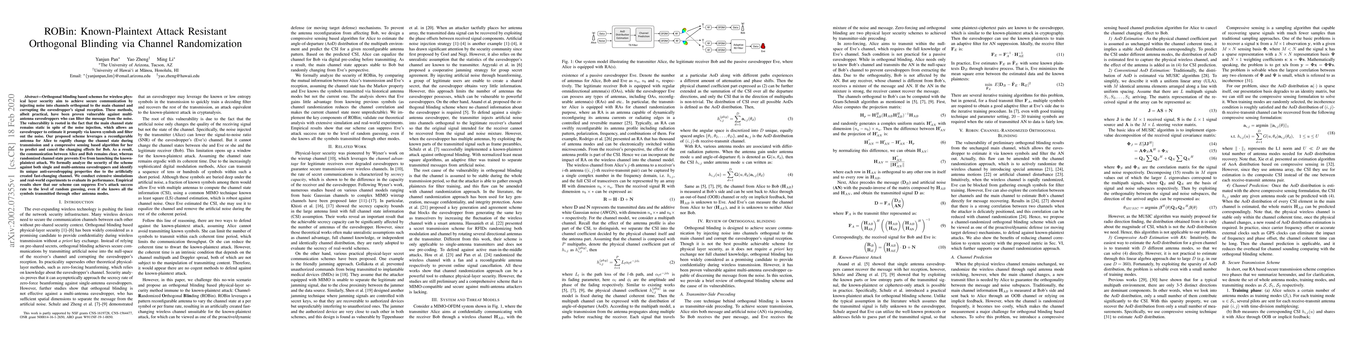 ROBin introduces a novel orthogonal blinding scheme using channel randomization to thwart known-plaintext attacks in wireless physical layer security, ensuring secure communication by dynamically altering channel states to prevent eavesdroppers from filtering out noise. The scheme employs reconfigurable antennas and compressive sensing to maintain clear communication while effectively thwarting eavesdropping attempts.