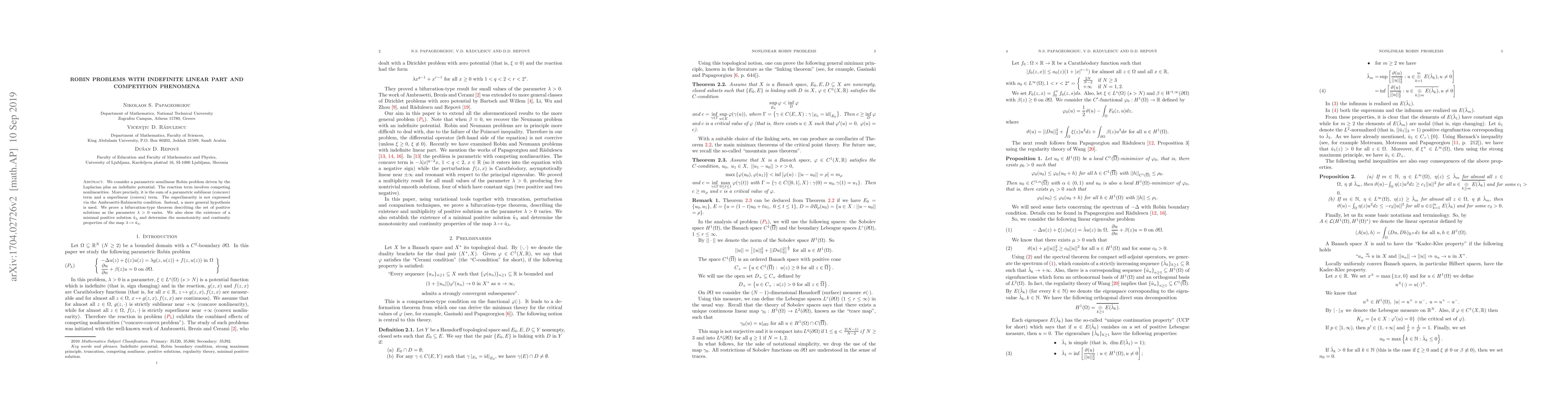 This paper studies a parametric semilinear Robin problem with an indefinite potential and competing nonlinearities, proving a bifurcation-type theorem for the set of positive solutions. It also establishes the existence of a minimal positive solution and examines the monotonicity and continuity properties of the solution map as the parameter varies.