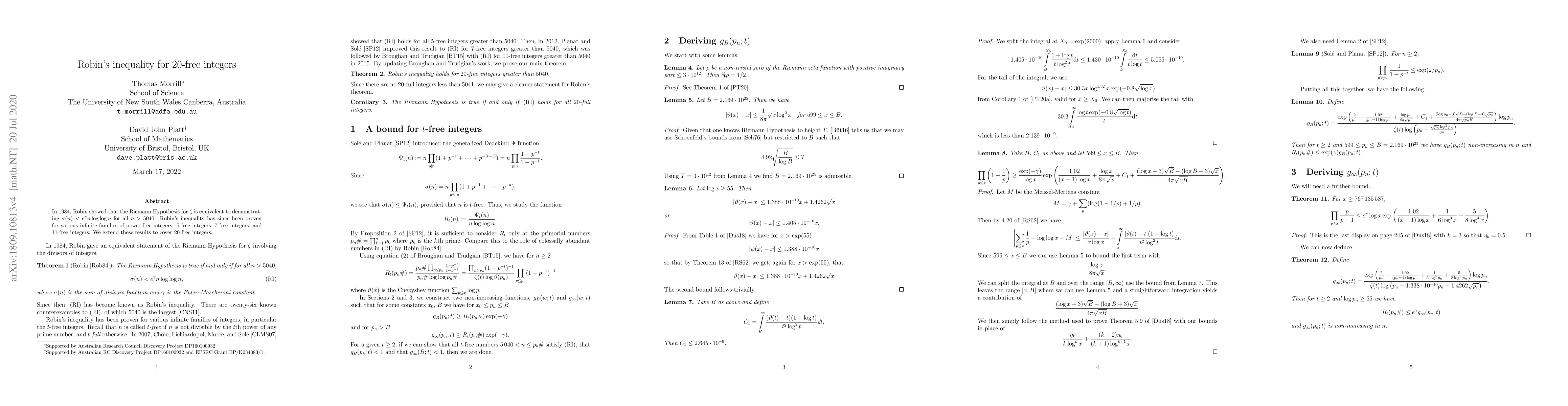 In 1984, Robin showed that the Riemann Hypothesis for $\zeta$ is equivalent to demonstrating $\sigma(n) < e^\gamma n \log \log n$ for all $n > 5040$. Robin's inequality has since been proven for various infinite families of power-free integers: $5$-free integers, $7$-free integers, and $11$-free integers. We extend these results to cover $20$-free integers.