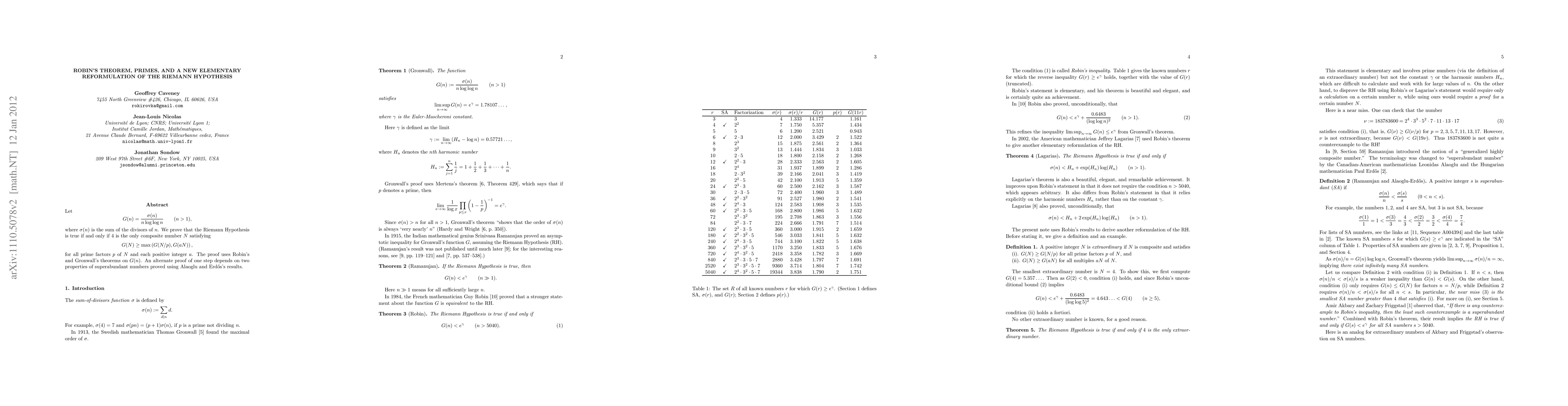 For n>1, let G(n)=\sigma(n)/(n log log n), where \sigma(n) is the sum of the divisors of n. We prove that the Riemann Hypothesis is true if and only if 4 is the only composite number N satisfying G(N) \ge \max(G(N/p),G(aN)), for all prime factors p of N and all multiples aN of N. The proof uses Robin's and Gronwall's theorems on G(n). An alternate proof of one step depends on two properties of superabundant numbers proved using Alaoglu and Erd\H{o}s's results.